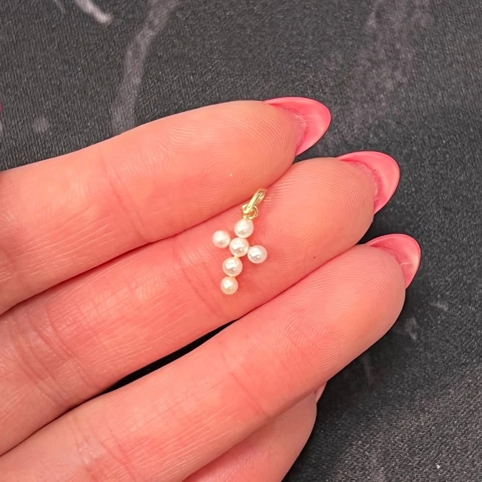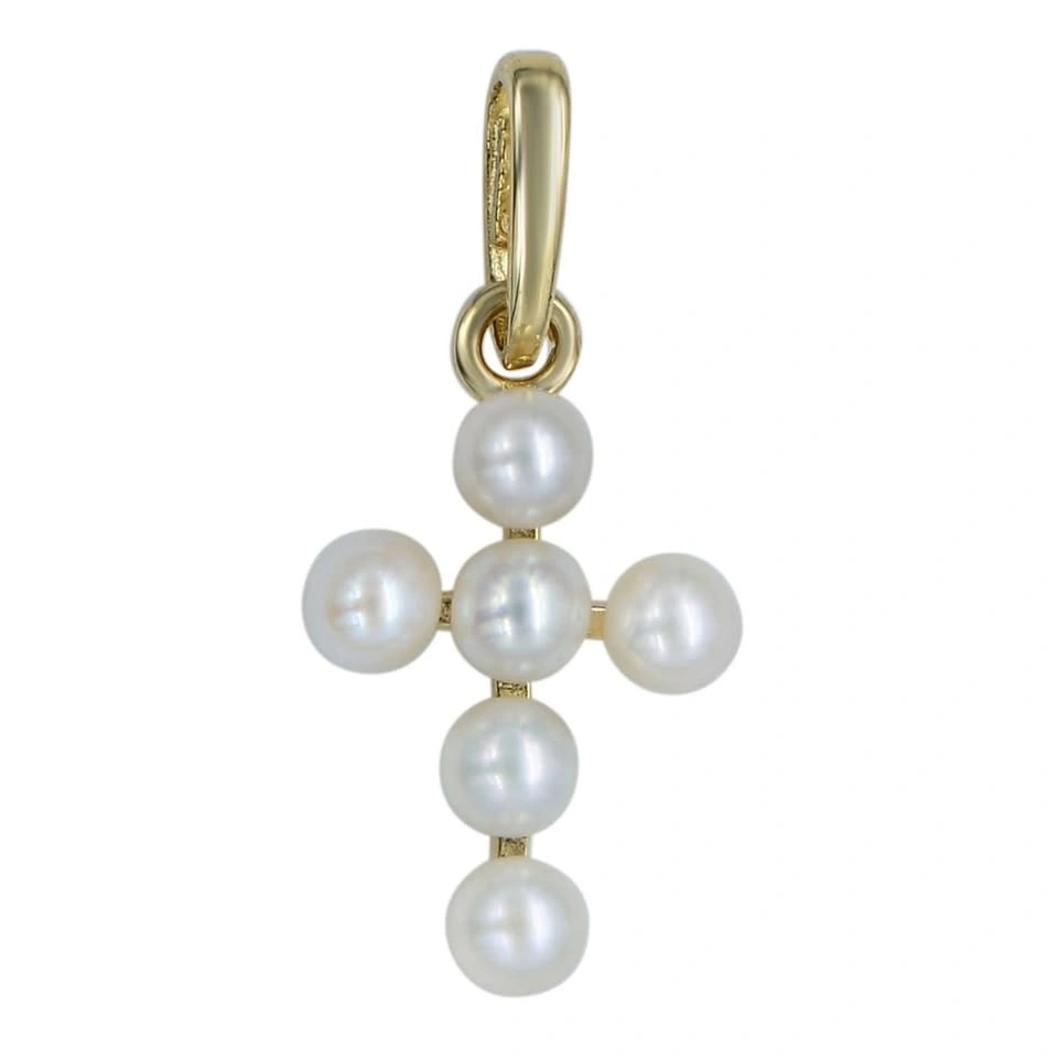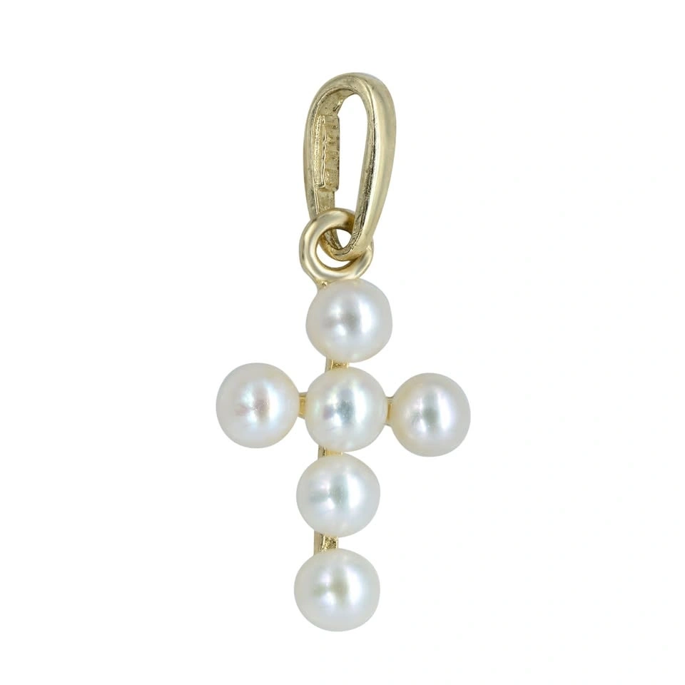 Embrace elegance and grace with this adorable and delicate petite pearl cross pendant, perfect for adding a touch of charm to your everyday look. Meticulously crafted in 14K yellow gold, this beautiful symbol of faith showcases six radiant cultured freshwater pearls arranged in a stunning cross design. With a measurement of 12mm long and a total weight of just 0.31 grams, it serves as an ideal gift for yourself or a cherished loved one. Let this pendant remind you of the beauty of faith and the joy of connection.