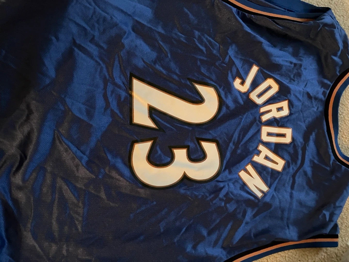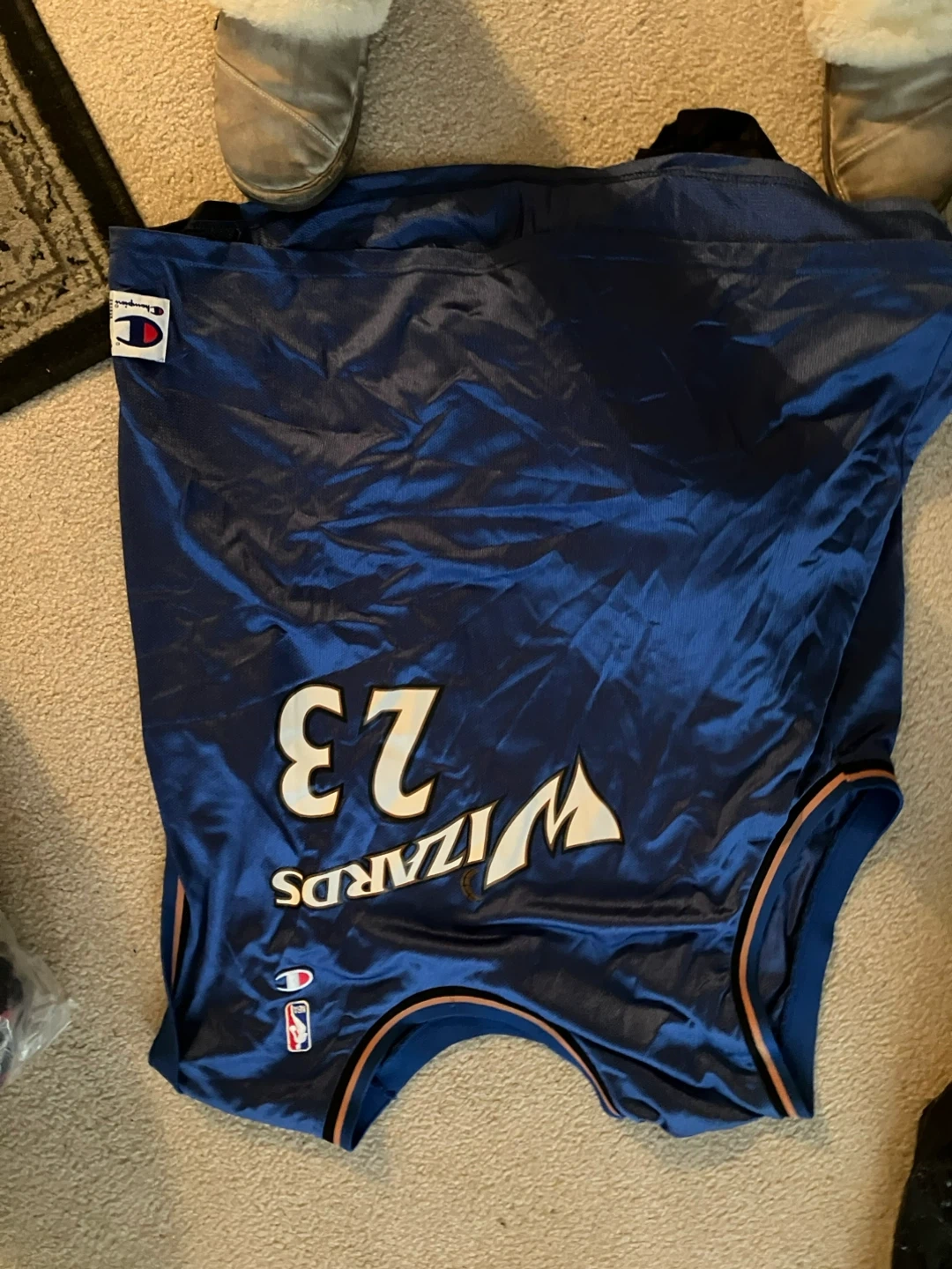 Selling a Champion Michael Jordan Wizards jersey in blue. It features the number 23 and the Wizards logo. Great for any basketball fan!