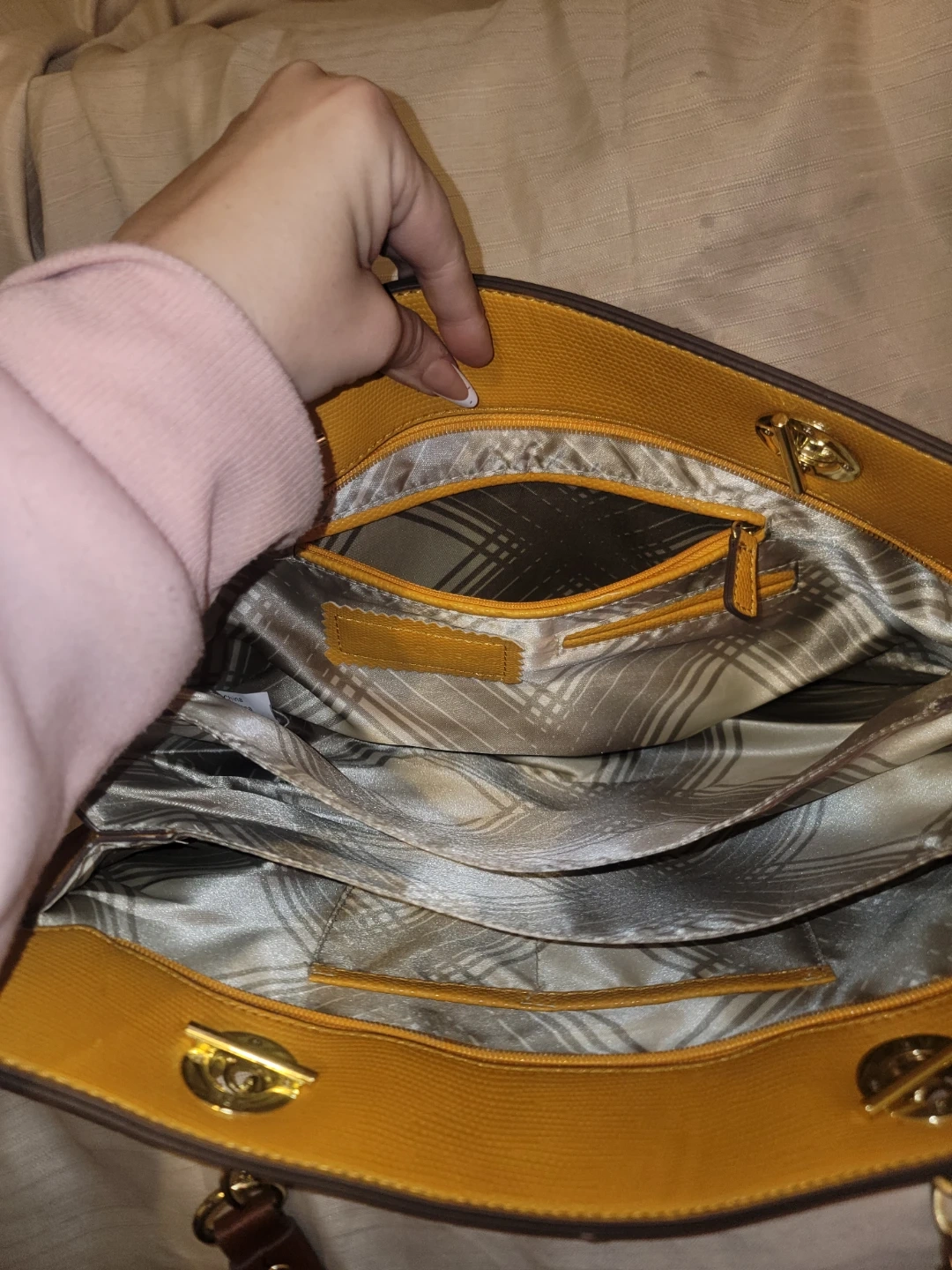 Yellow tote bag by London Fog. It has a textured exterior with brown leather handles. Multiple interior pockets for organization.