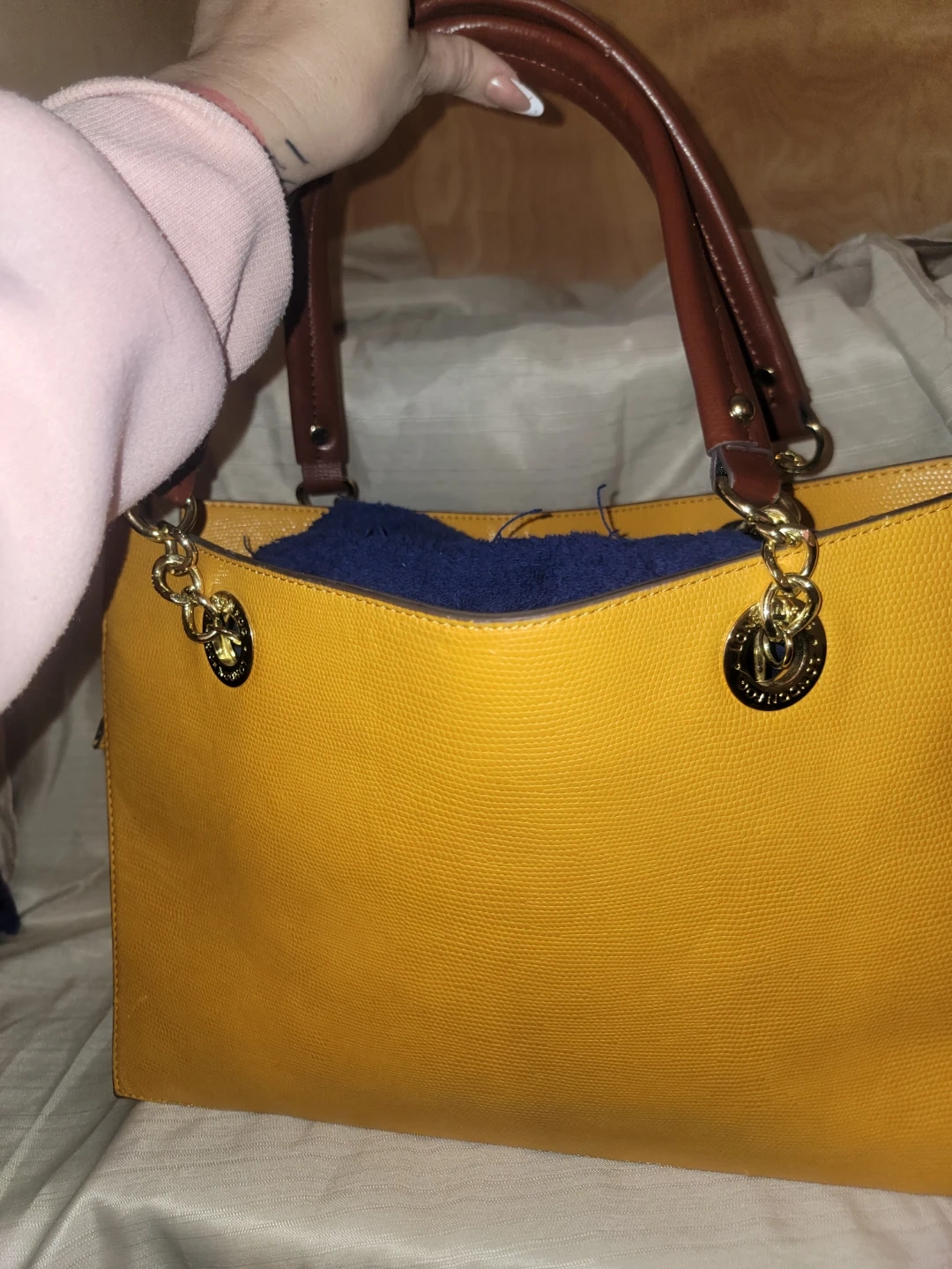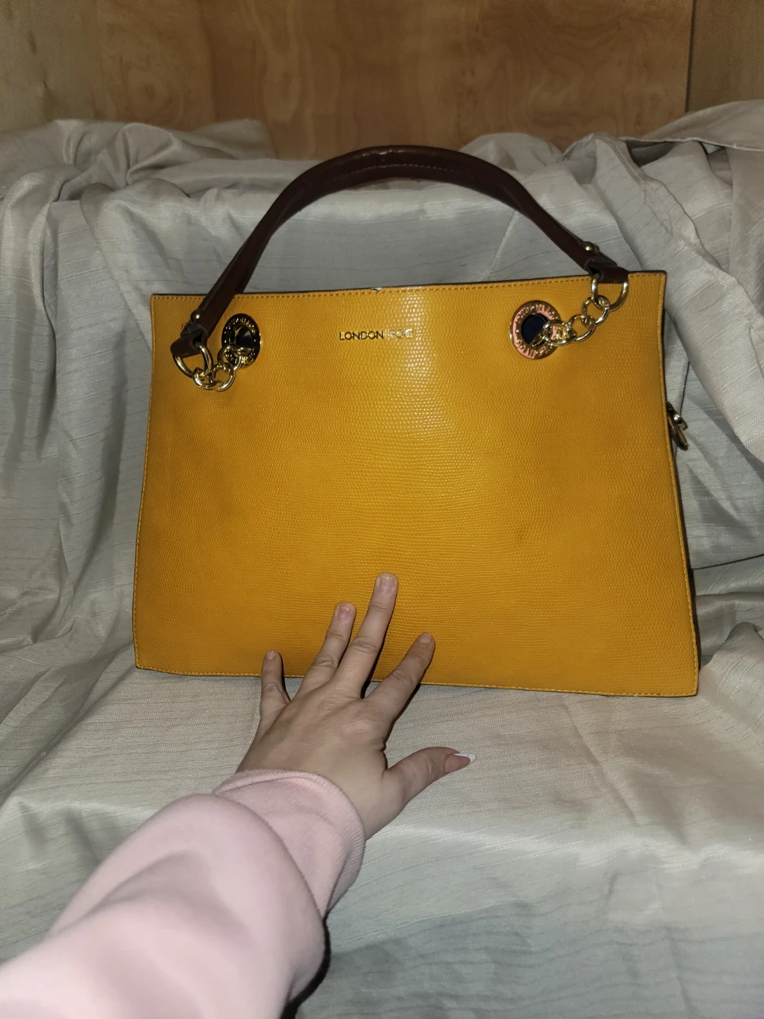 Yellow tote bag by London Fog. It has a textured exterior with brown leather handles. Multiple interior pockets for organization.