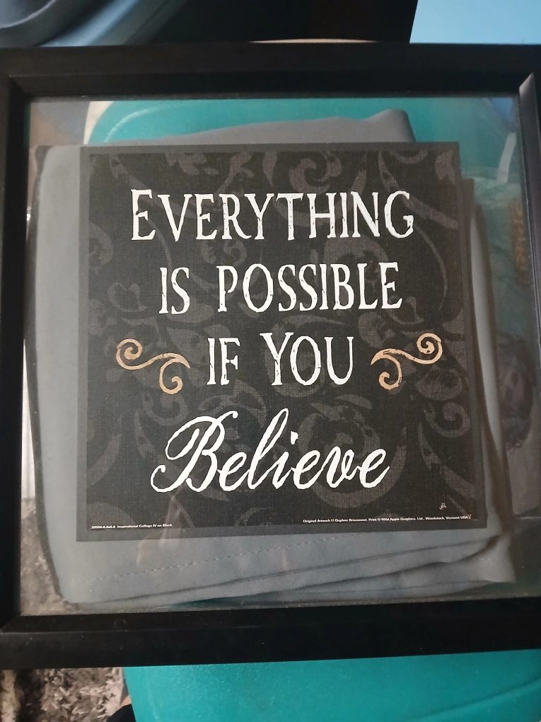 Framed inspirational quote, black frame, grey mat, black background with gold accents. Quote reads "Everything is possible if you believe".
