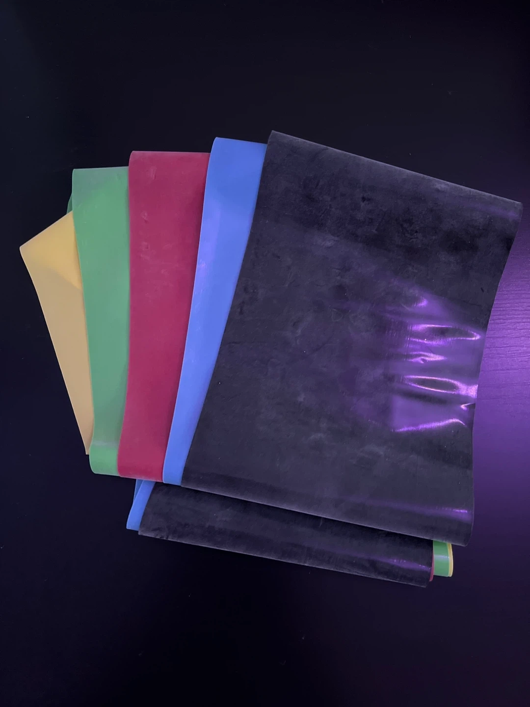 A set of five resistance bands in yellow, green, red, blue, and black - different resistant levels. Latex material.