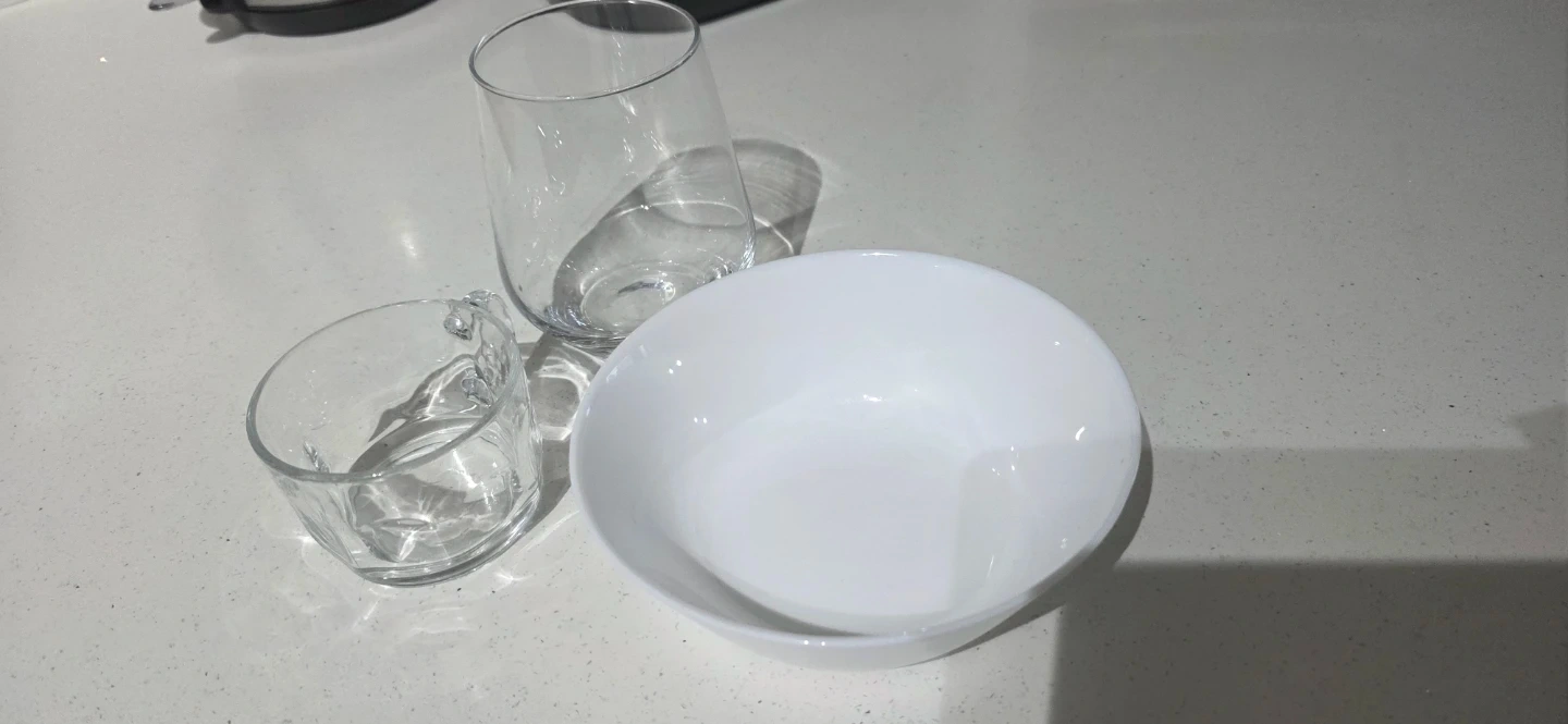 This set includes a clear glass tumbler and a small glass cup with a handle. It also comes with a white ceramic bowl. These are simple kitchen staples for everyday use.
