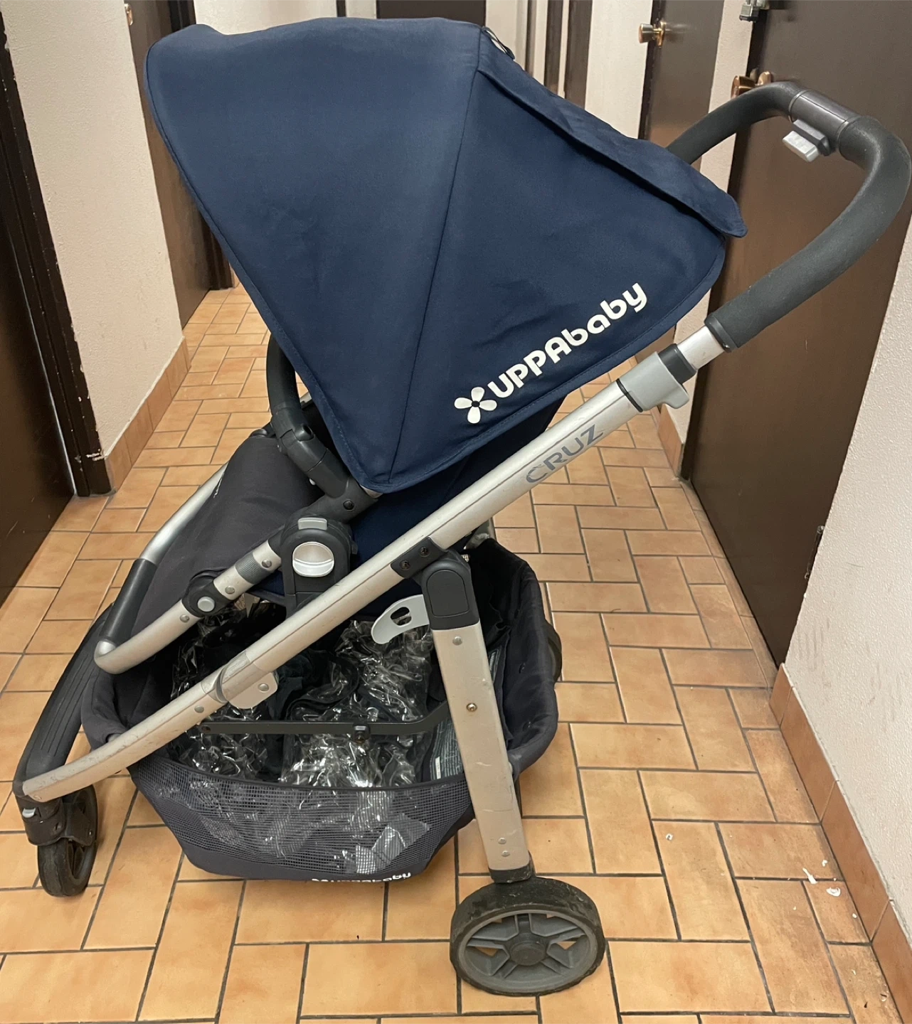 This UPPAbaby Cruz stroller comes in a classic navy colour. It features an adjustable canopy and a convenient storage basket underneath. Great for everyday outings!