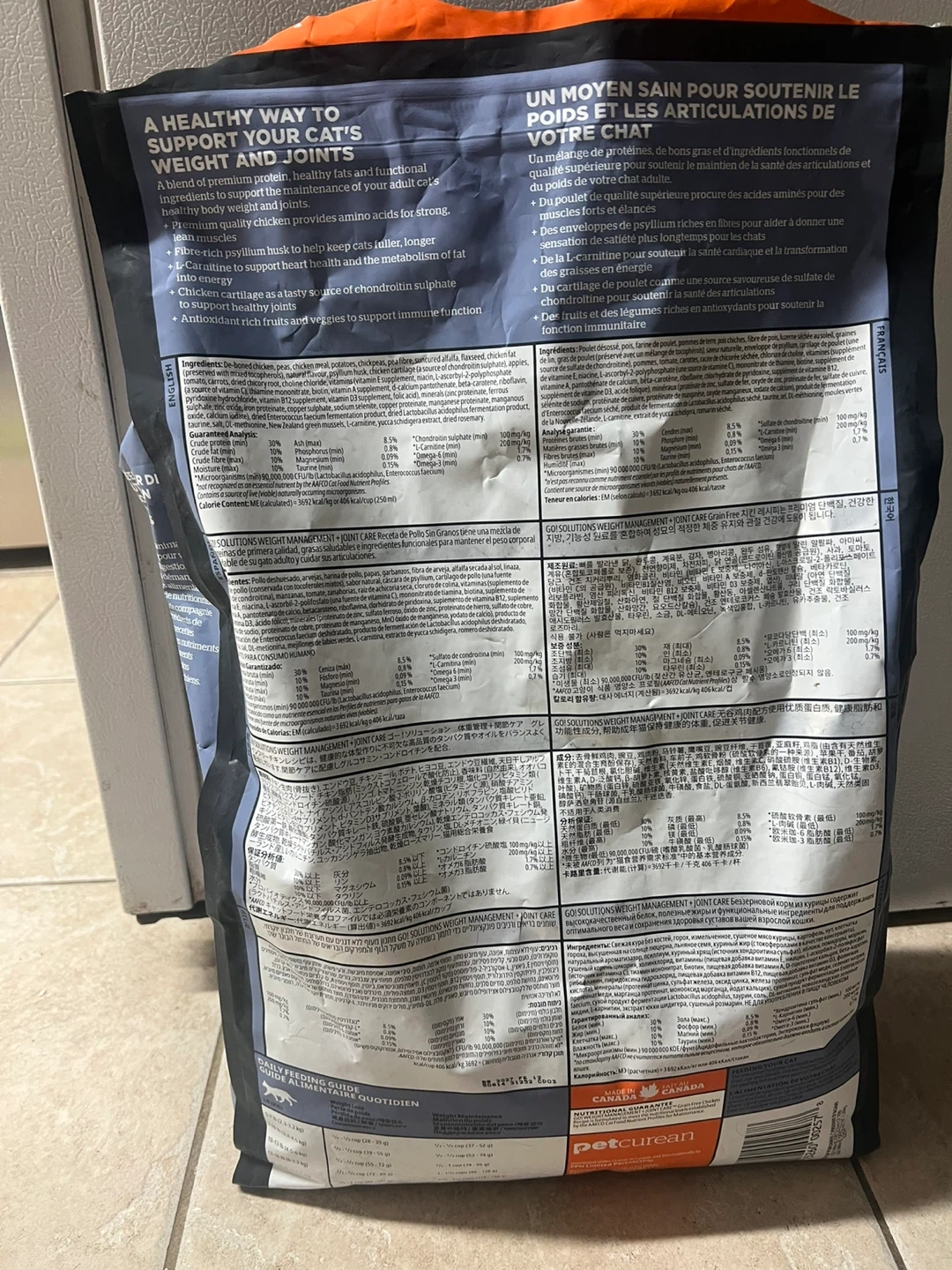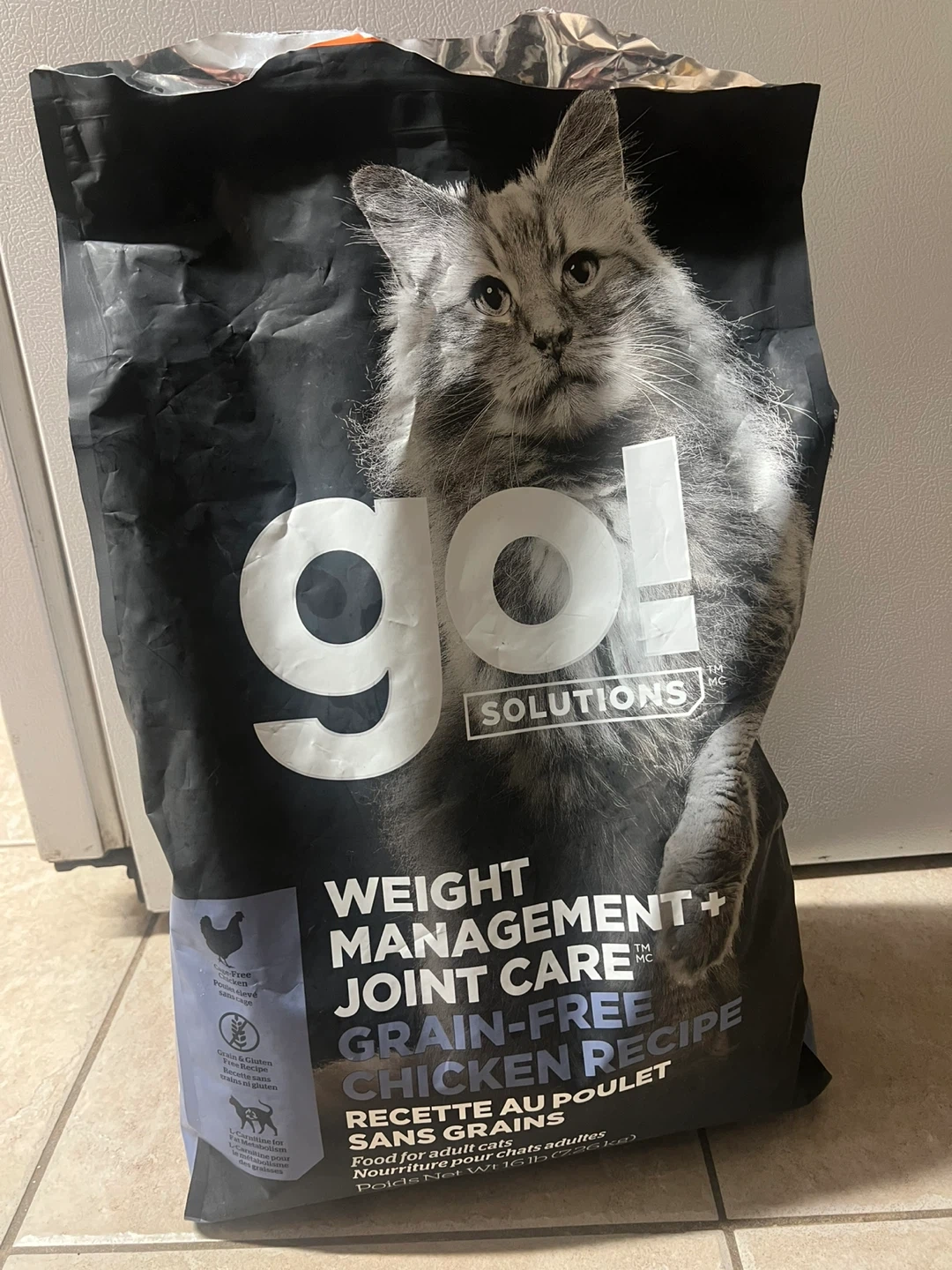 This is a bag of GO! SOLUTIONS Weight Management + Joint Care Grain-Free Chicken Recipe cat food. It's formulated for adult cats and is grain-free. L-Carnitine is included for fat metabolism. This food helps support urinary tract health and immune function.