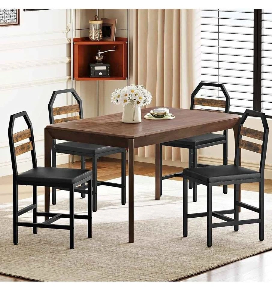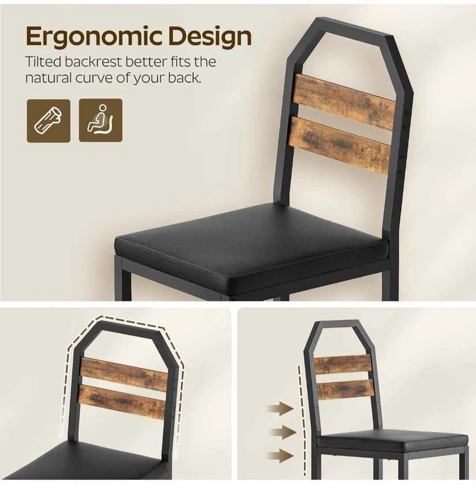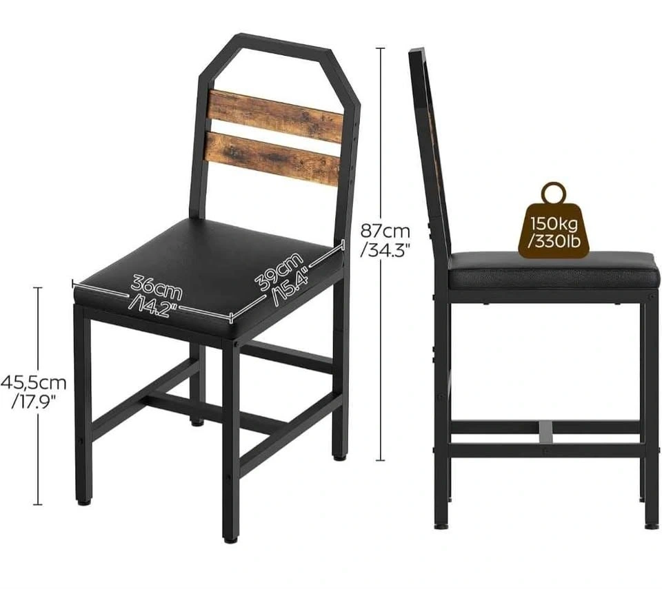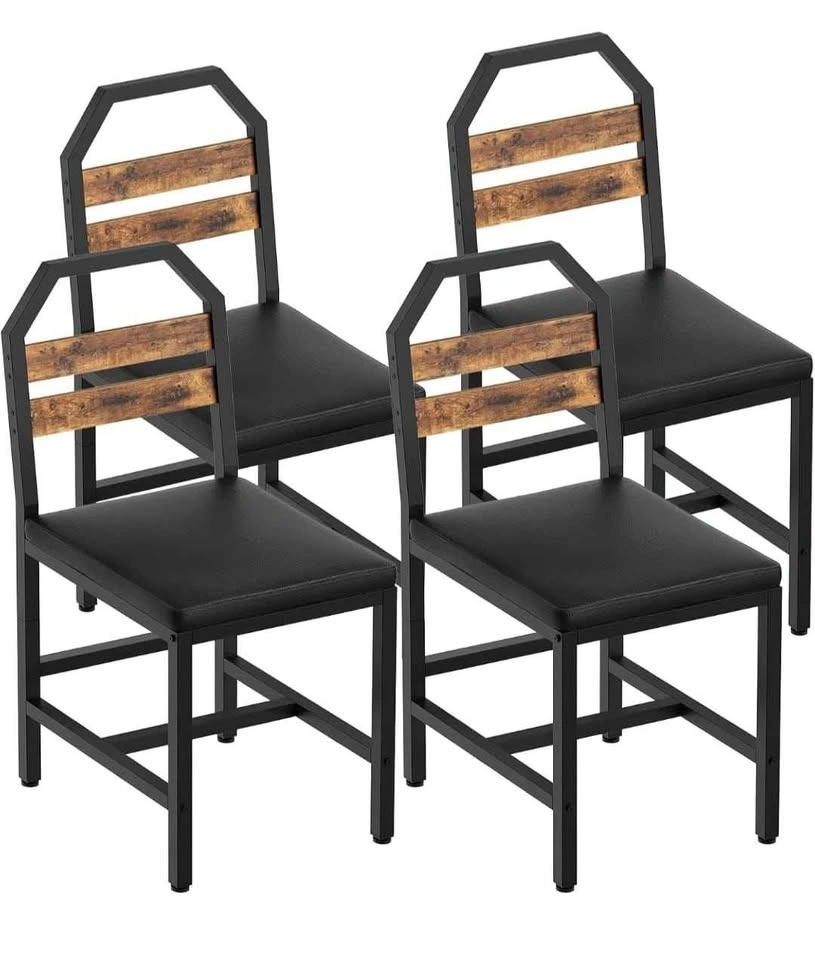 Set of 4 upholstered dining chairs with back support and metal frames, industrial style. Perfect for your dining room, kitchen, or living room. Rustic brown finish.