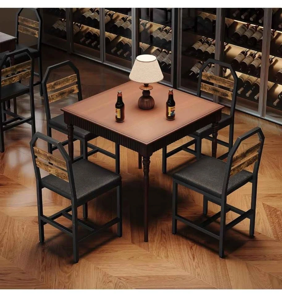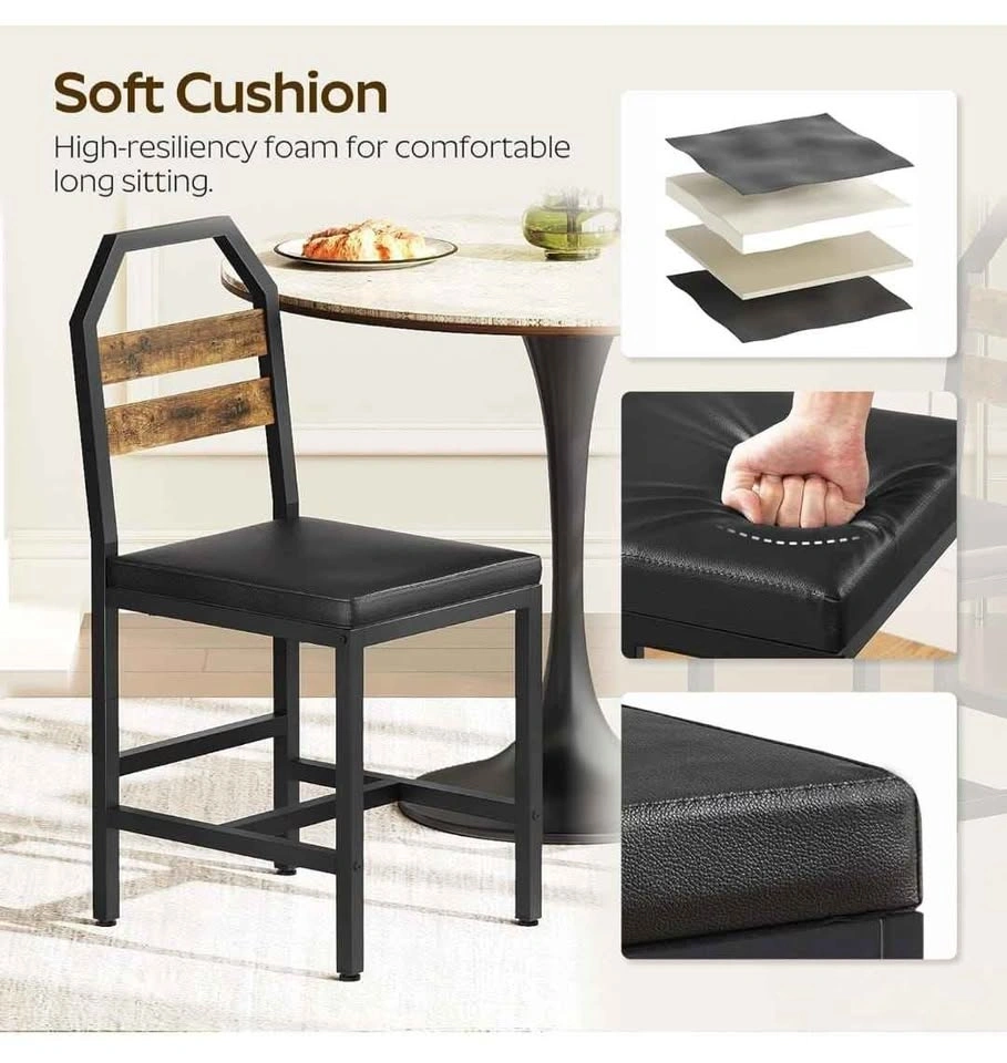 Set of 4 upholstered dining chairs with back support and metal frames, industrial style. Perfect for your dining room, kitchen, or living room. Rustic brown finish.