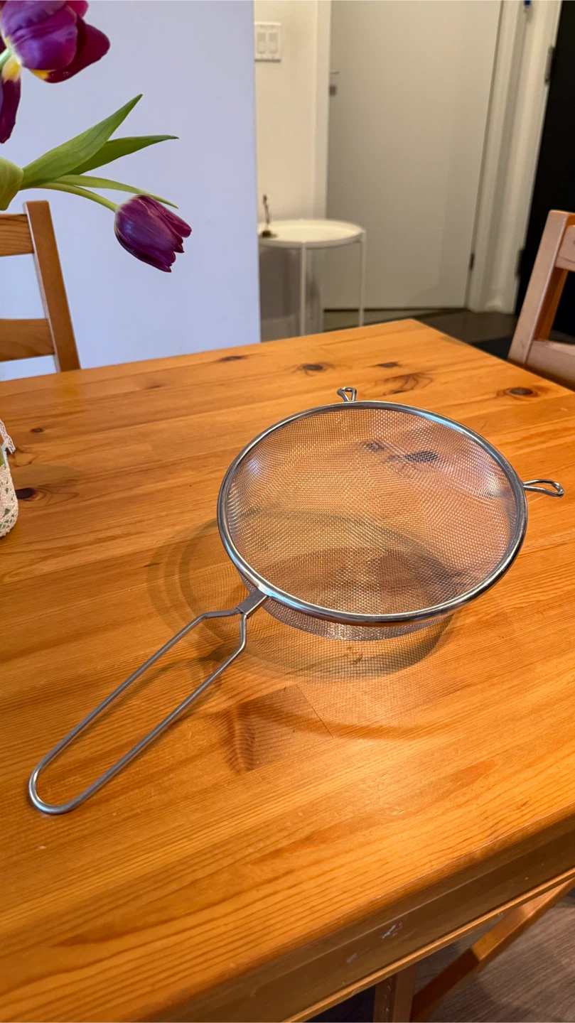 This is a stainless steel mesh strainer with a long handle. It's perfect for sifting dry ingredients or draining wet ones. The fine mesh is great for straining seeds and pulp.