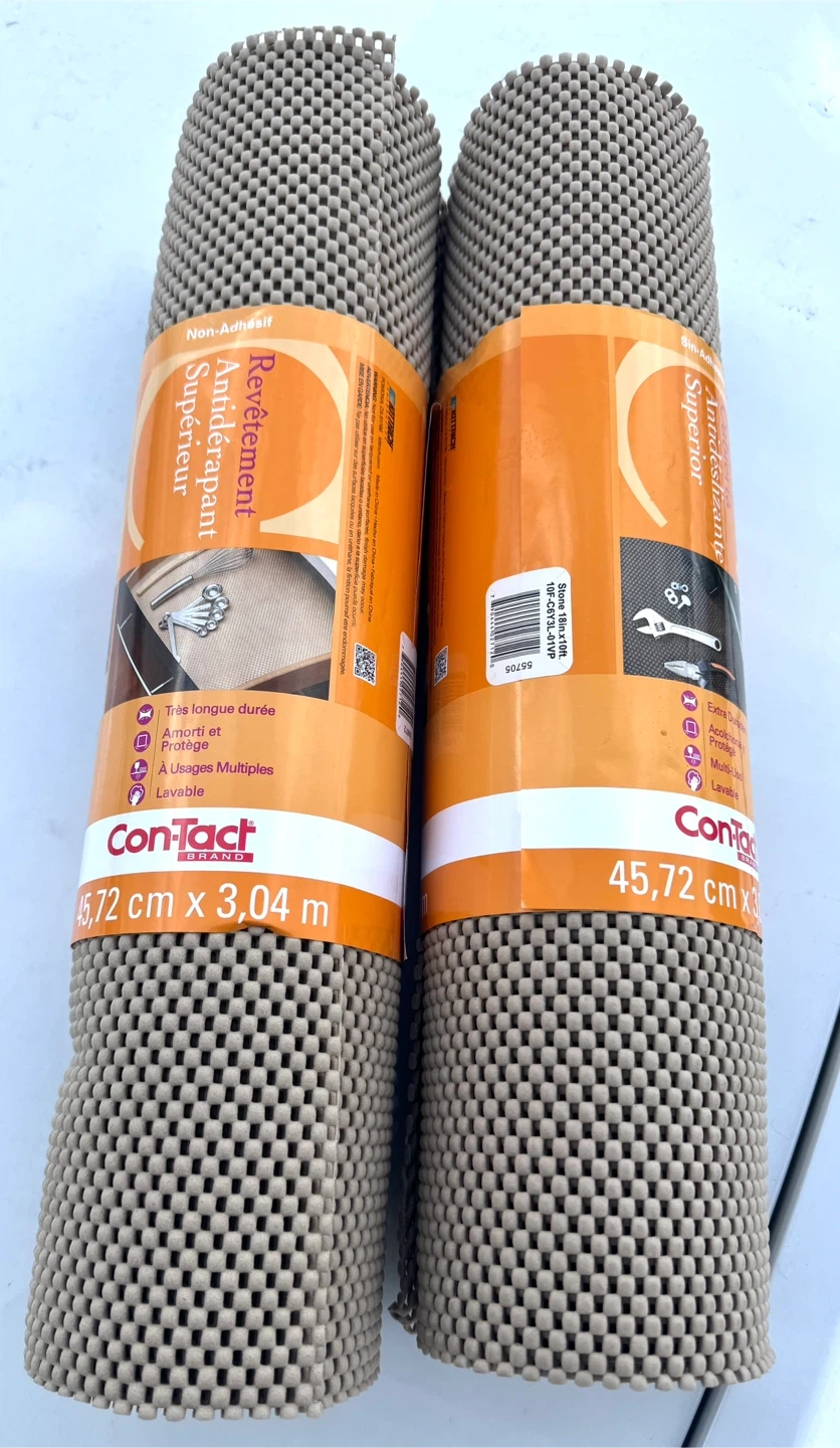 Selling two rolls of Con-Tact Brand Grip Premium Liner. Each roll measures 45.72 cm x 3.04 m (18 in x 10 ft). These liners are non-adhesive and provide superior anti-slip protection. They're extra durable, multi-purpose, and washable, making them great for various uses around the house