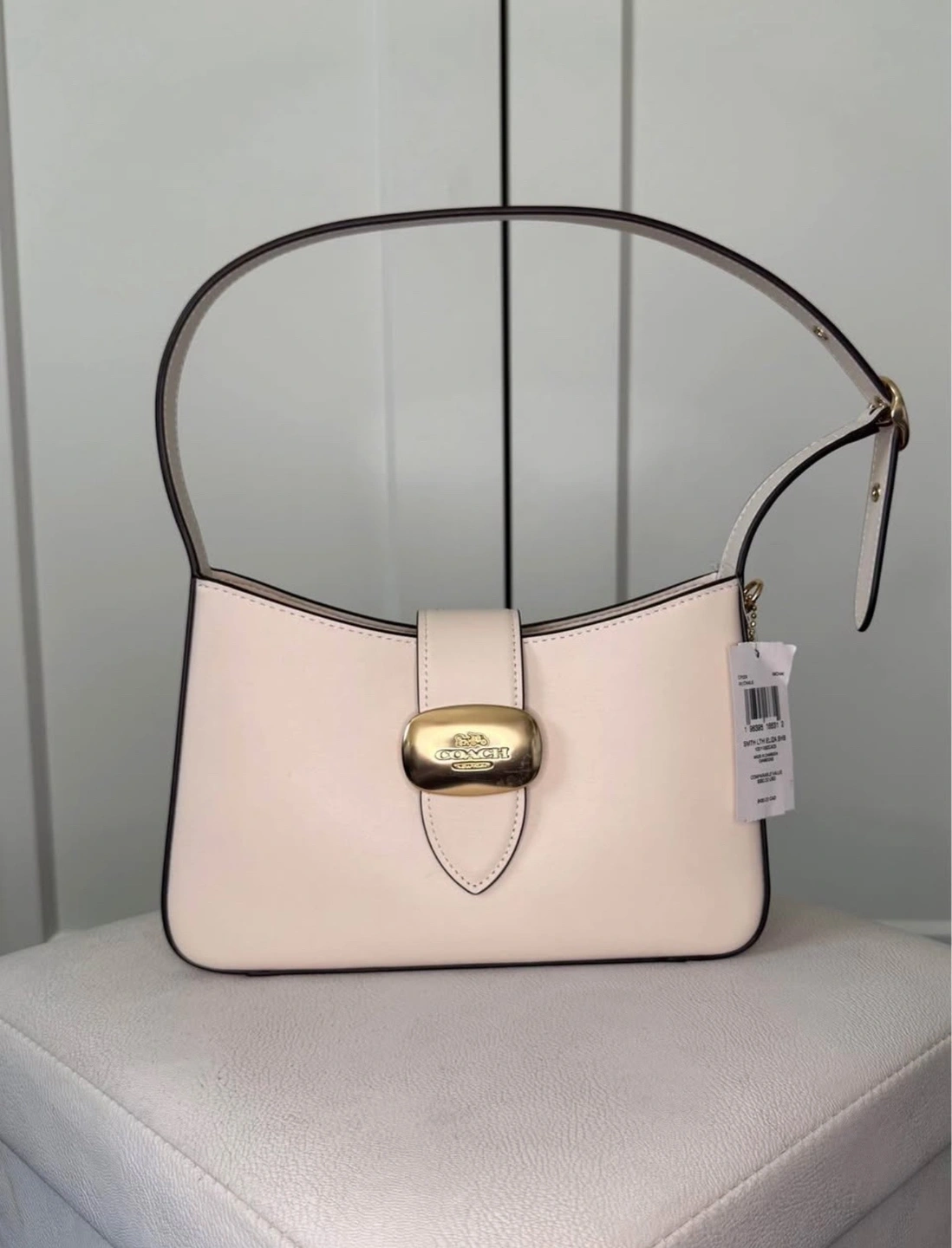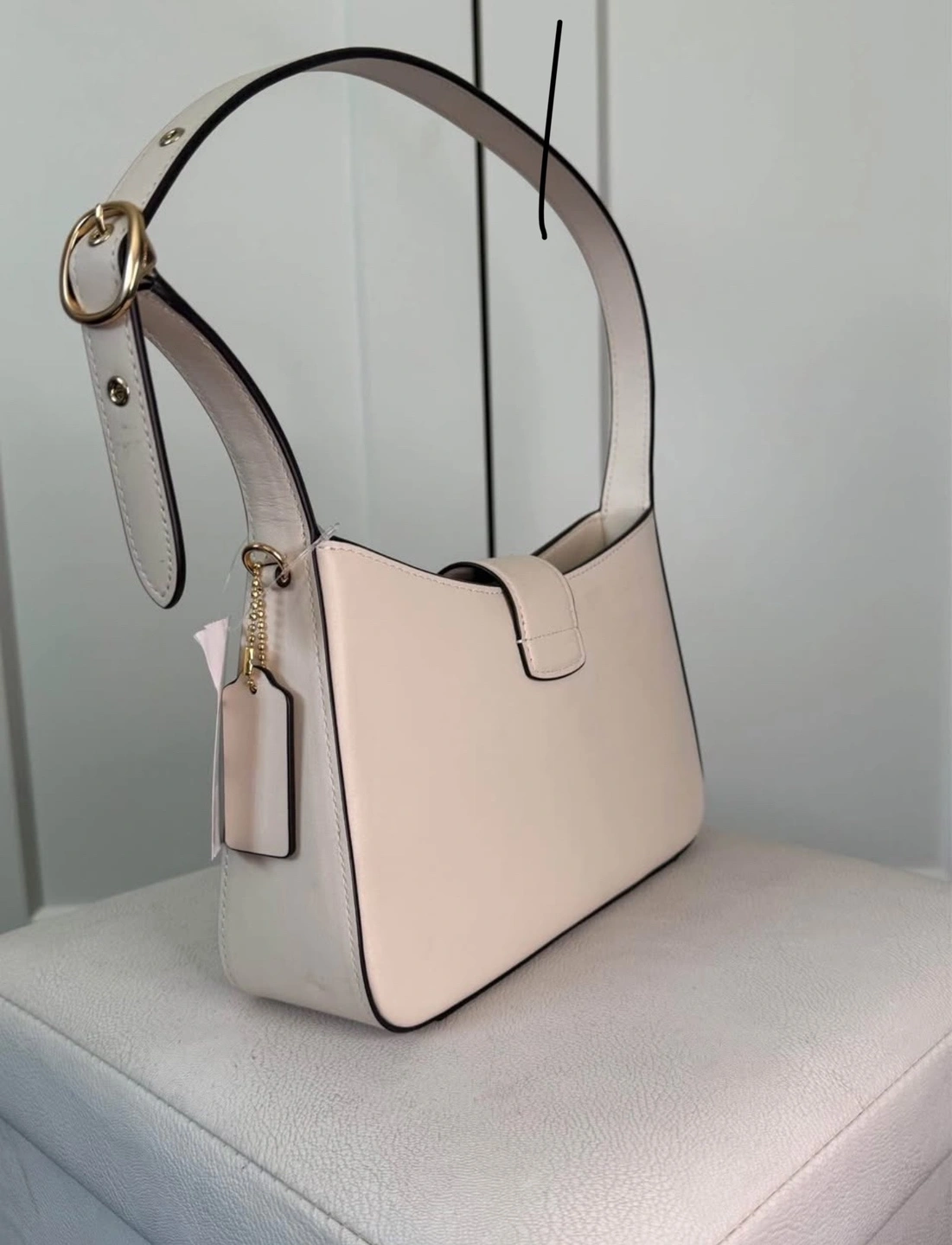 Brand-new Coach purse in elegant cream with a structured silhouette, gold-tone hardware, and an adjustable shoulder strap for a timeless, chic look.