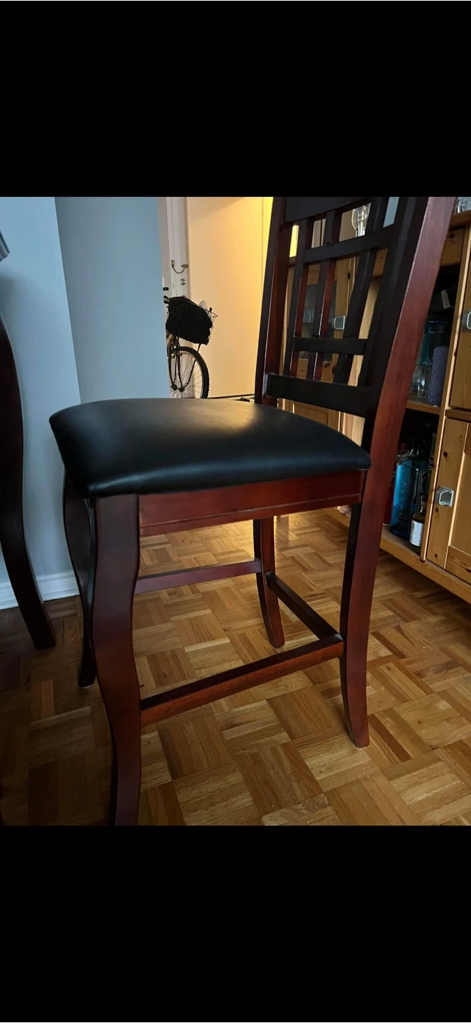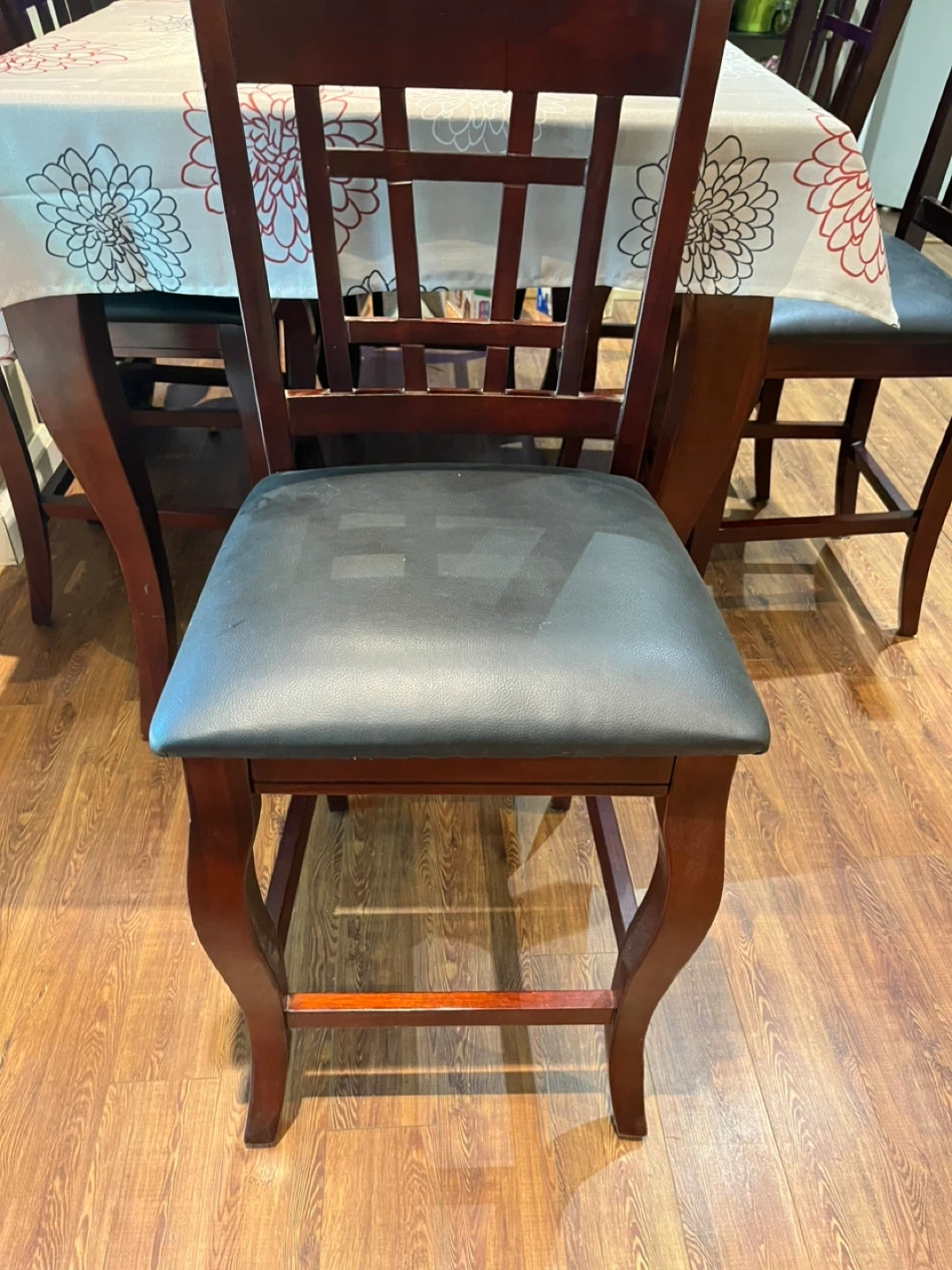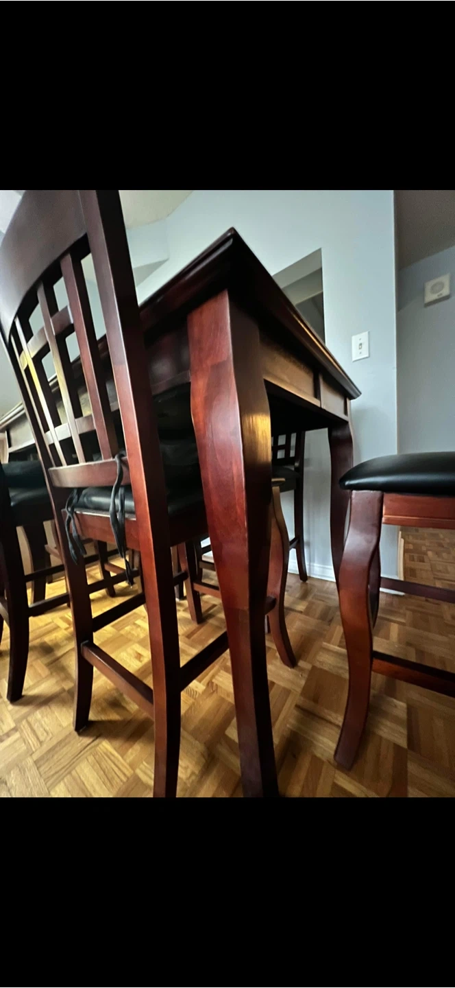 A sturdy wooden dining table set perfect for family meals. It comes with six chairs featuring comfortable black upholstered seats. The table has a smooth, dark wood finish,it has an extra piece for extending to 8,also with Suzan Tray.