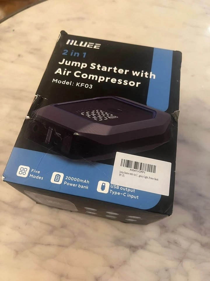 Handy IILUEE KF03 jump starter. This thing is super versatile, 2 in 1 design with an air compressor built right in. Also a 20000mAh power bank, so you can charge your phone too. Good for jump starting up to 8.5L gas or 8.0L diesel engines. Has a bright LED display and an emergency light, which is always useful. USB output and Type-C input. Spark-proof and UL2743 approved, so it's safe to use. Feel free to message if you have any questions!
