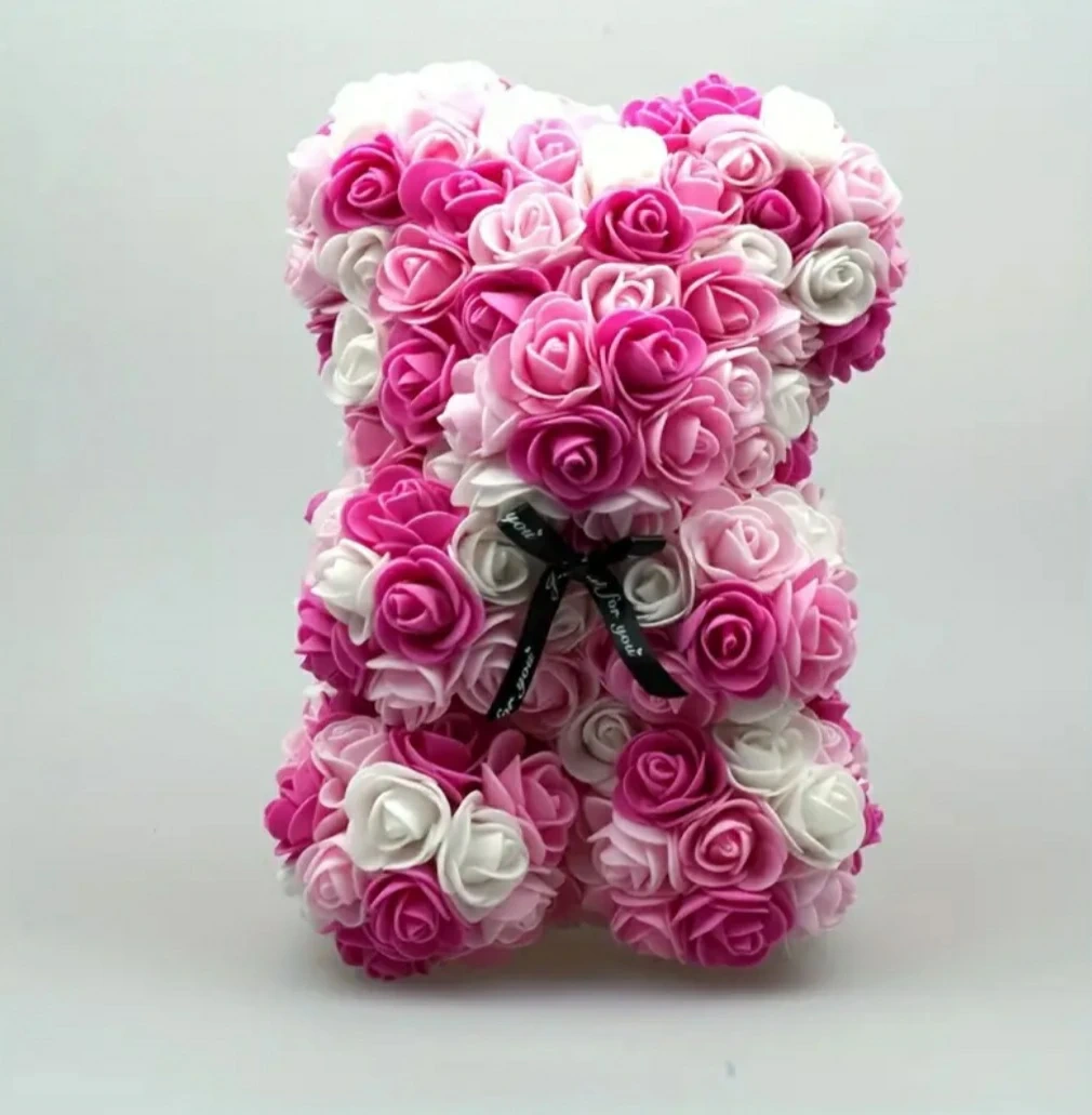 This rose bear is crafted from artificial roses and features a heart design on the chest. It stands 24cm (9.5 inches) tall with a width of 16cm (6.3 inches). A perfect decorative piece for any occasion!