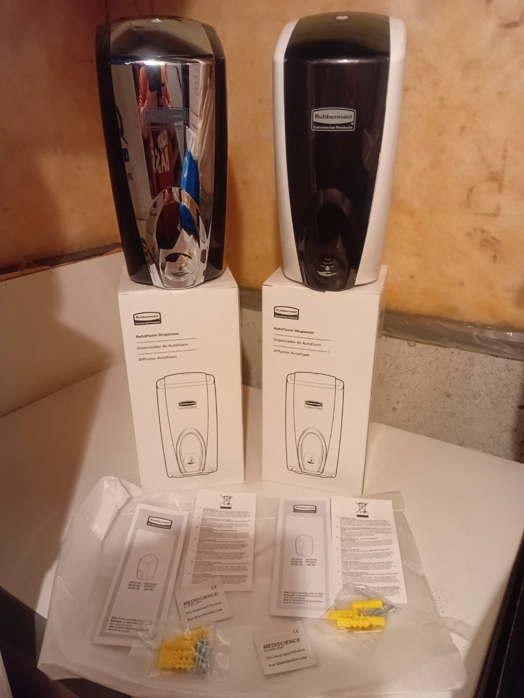 This is a Rubbermaid Commercial auto foam soap dispenser. It's white & black or black & chrome with an automatic sensor. Great for commercial washrooms!