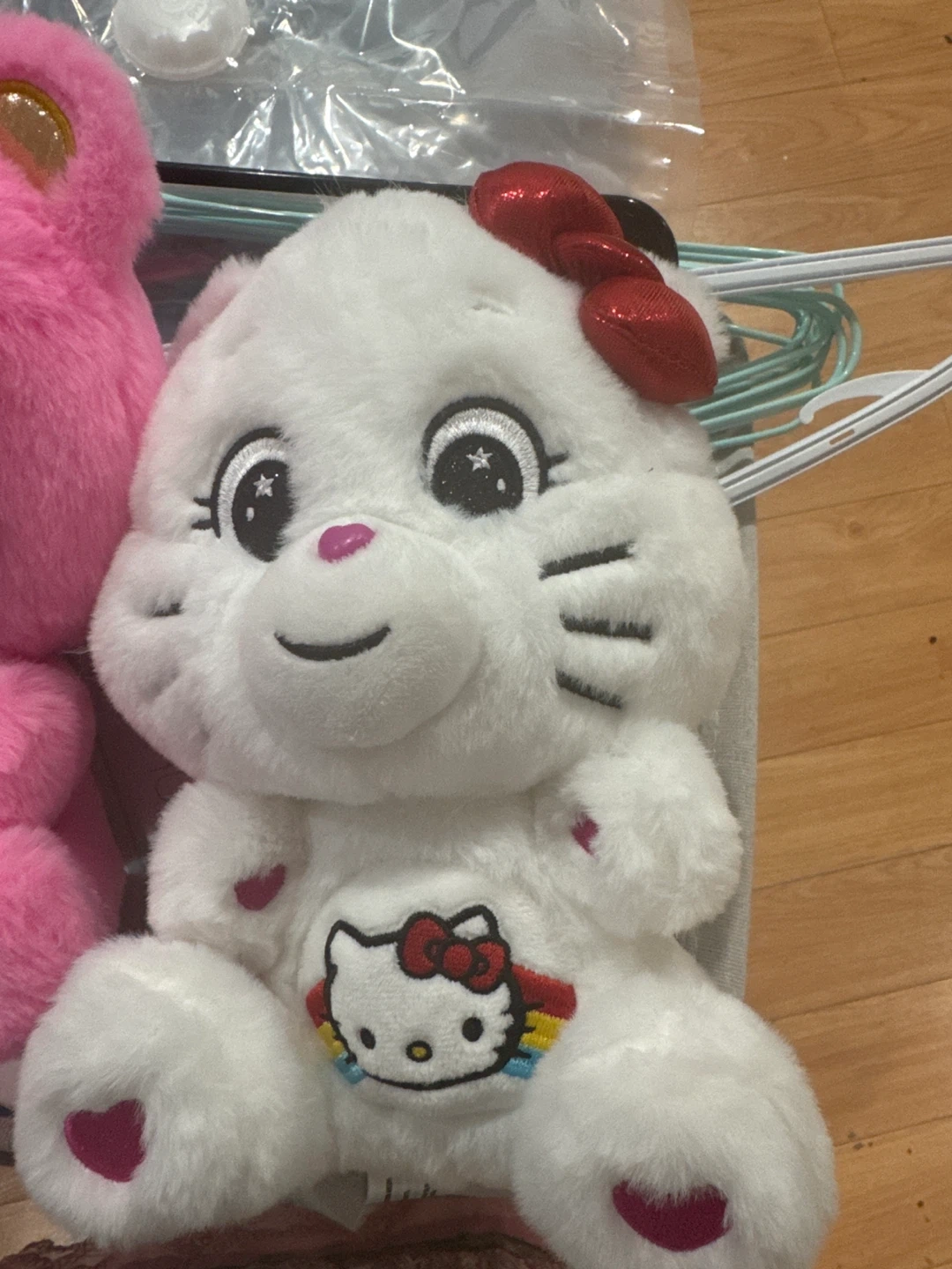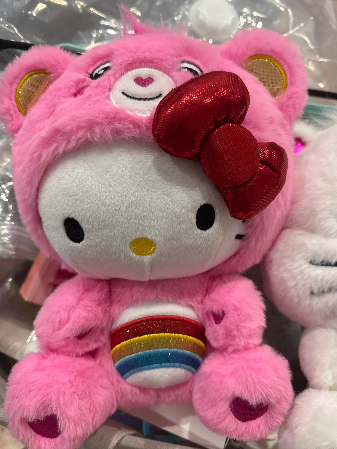 Two plush toys featuring a collaboration between Care Bears and Hello Kitty. One is a pink bear with a rainbow belly, dressed as Hello Kitty. The other is a white cat-like bear with a Hello Kitty emblem and rainbow stripes on its chest. Both have red bows.