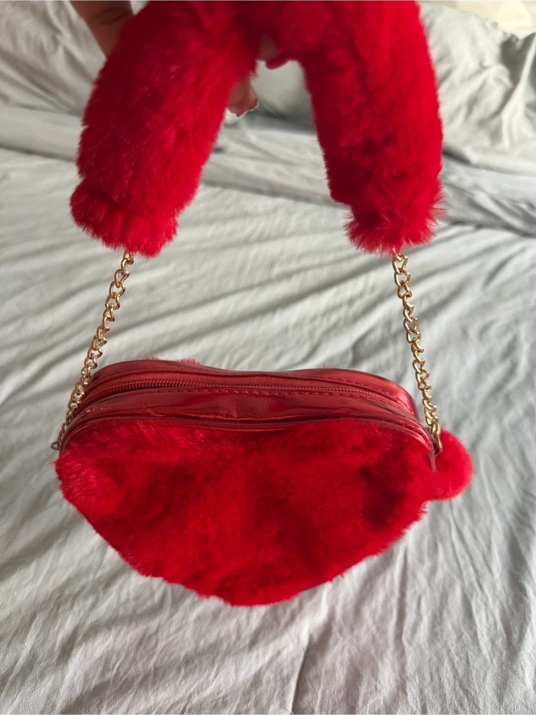 Super cute red heart-shaped mini purse. It's covered in soft faux fur with a shiny red trim. Comes with a gold chain strap and a fluffy pom-pom charm. Zipper closure.