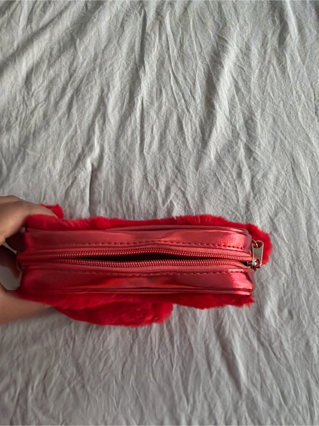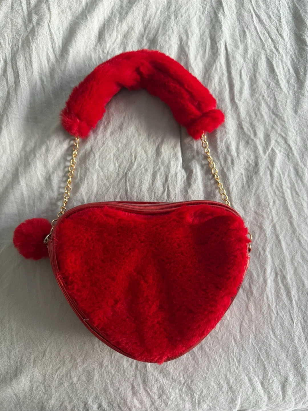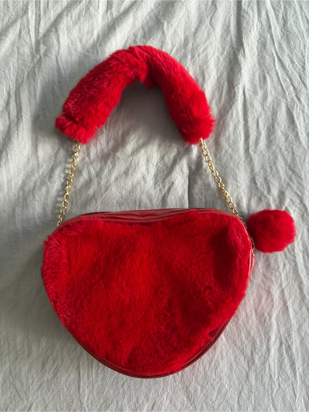 Super cute red heart-shaped mini purse. It's covered in soft faux fur with a shiny red trim. Comes with a gold chain strap and a fluffy pom-pom charm. Zipper closure.