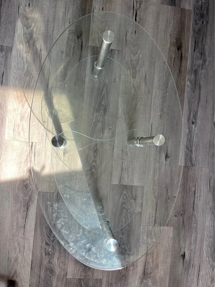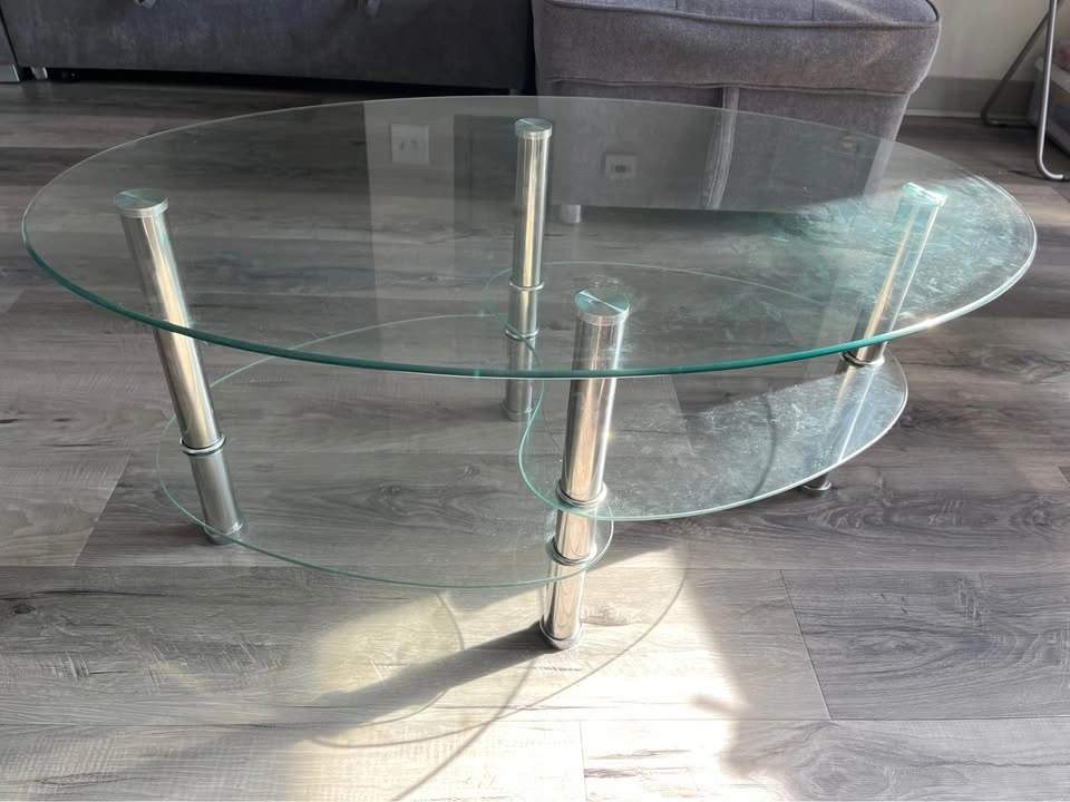 Selling a sleek modern 3-tier oval glass coffee table with chrome/stainless steel post legs. A classic, elegant piece that suits any living room or condo!