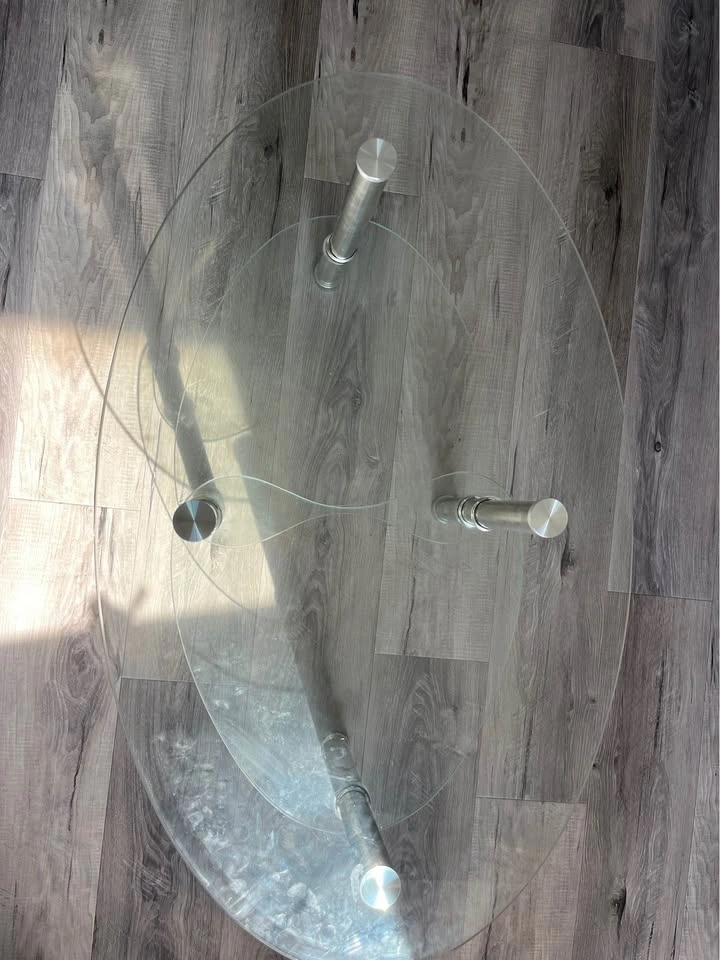 Selling a sleek modern 3-tier oval glass coffee table with chrome/stainless steel post legs. A classic, elegant piece that suits any living room or condo!