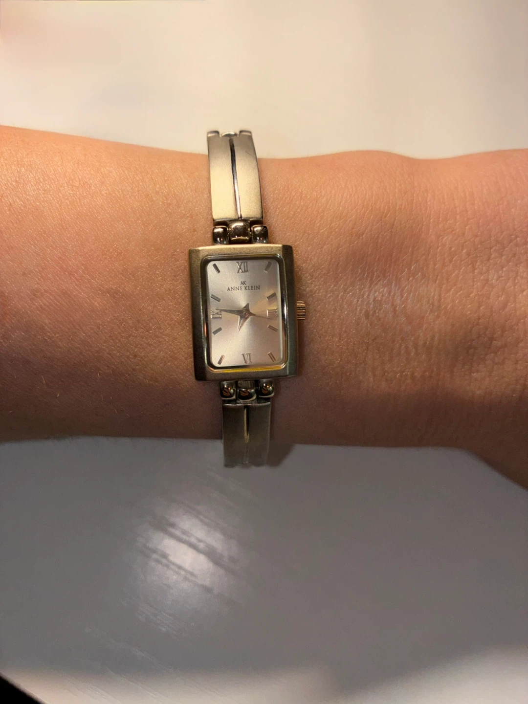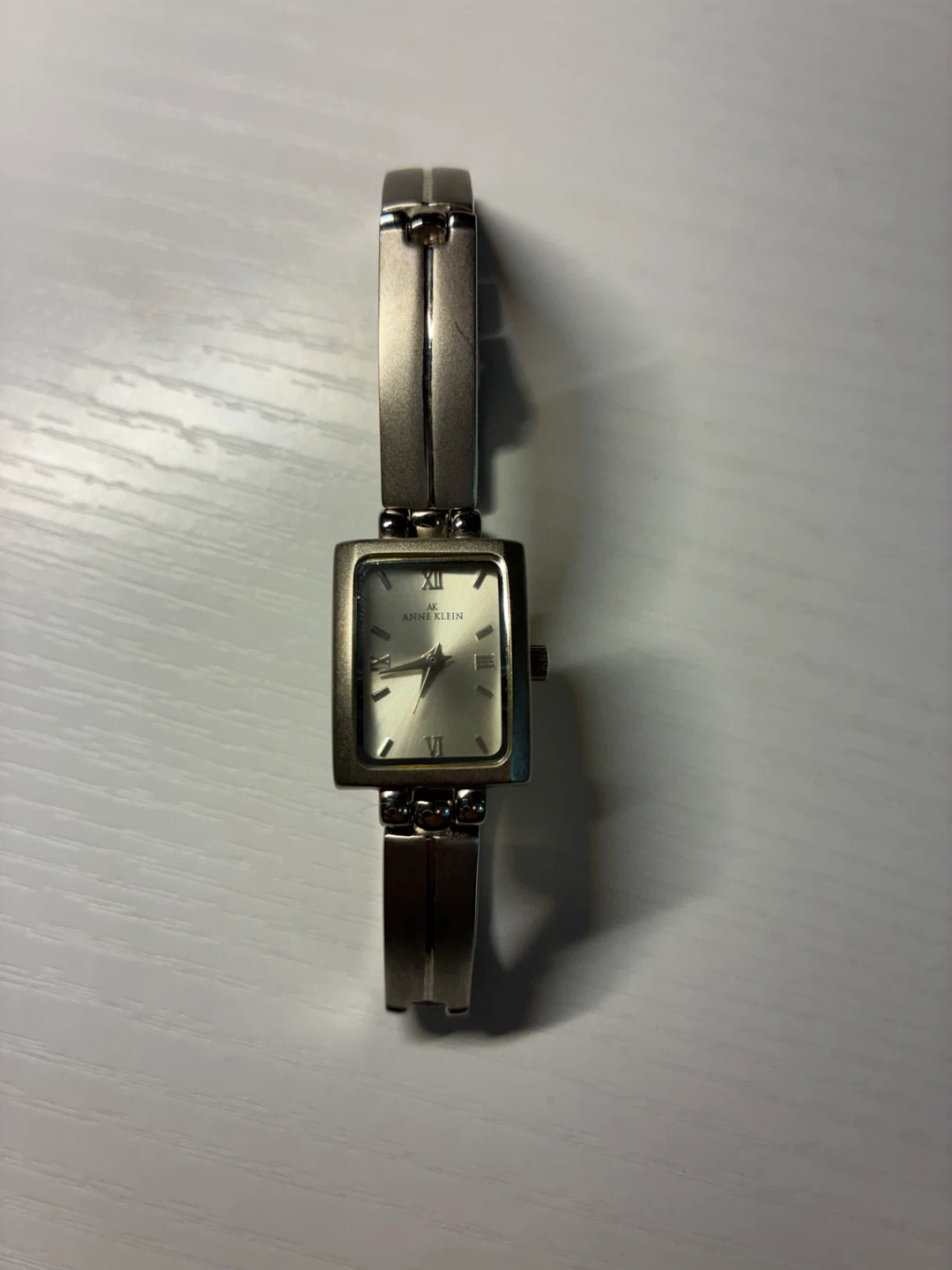 Anne Klein women's rectangular wristwatch. It features a silver-tone metal bracelet and a light-colored watch face with Roman numerals and gold-tone accents. This watch has a classic, elegant design.