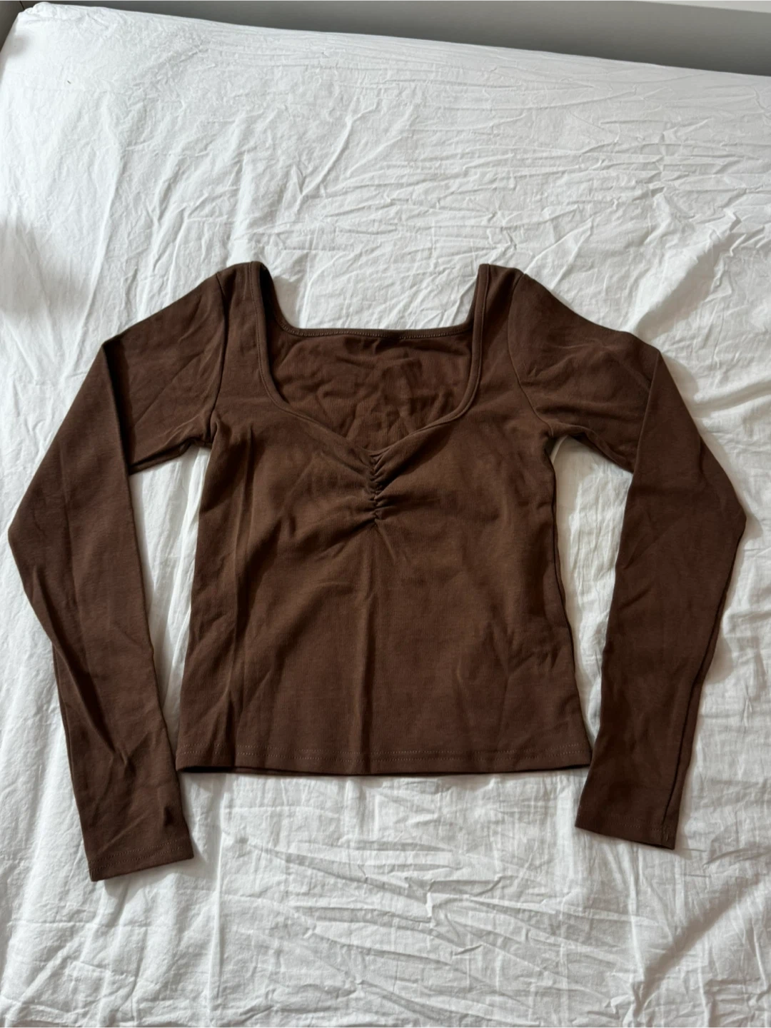 A cute brown long-sleeve top with a ruched detail at the bust. It features a square neckline and is made of a comfortable, stretchy material. This top is perfect for layering or wearing on its own!