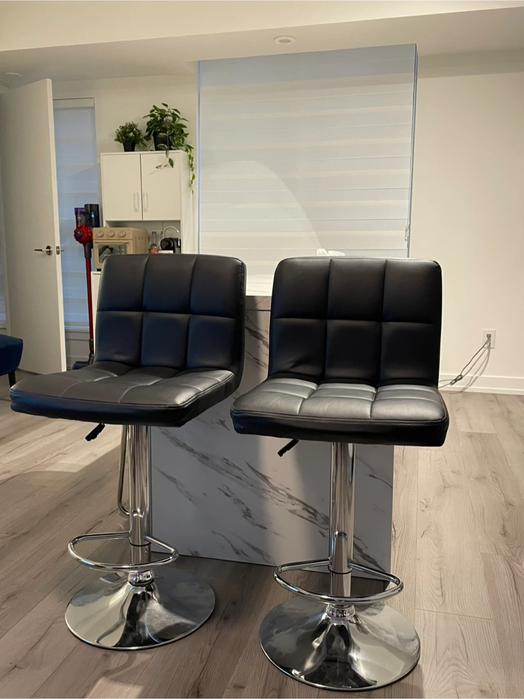 Selling a set of two stylish black bar stools! These stools feature a comfortable, cushioned seat and a sturdy chrome base with a footrest. They're perfect for adding a modern touch to your kitchen island or home bar. They are in great condition and ready for a new home
