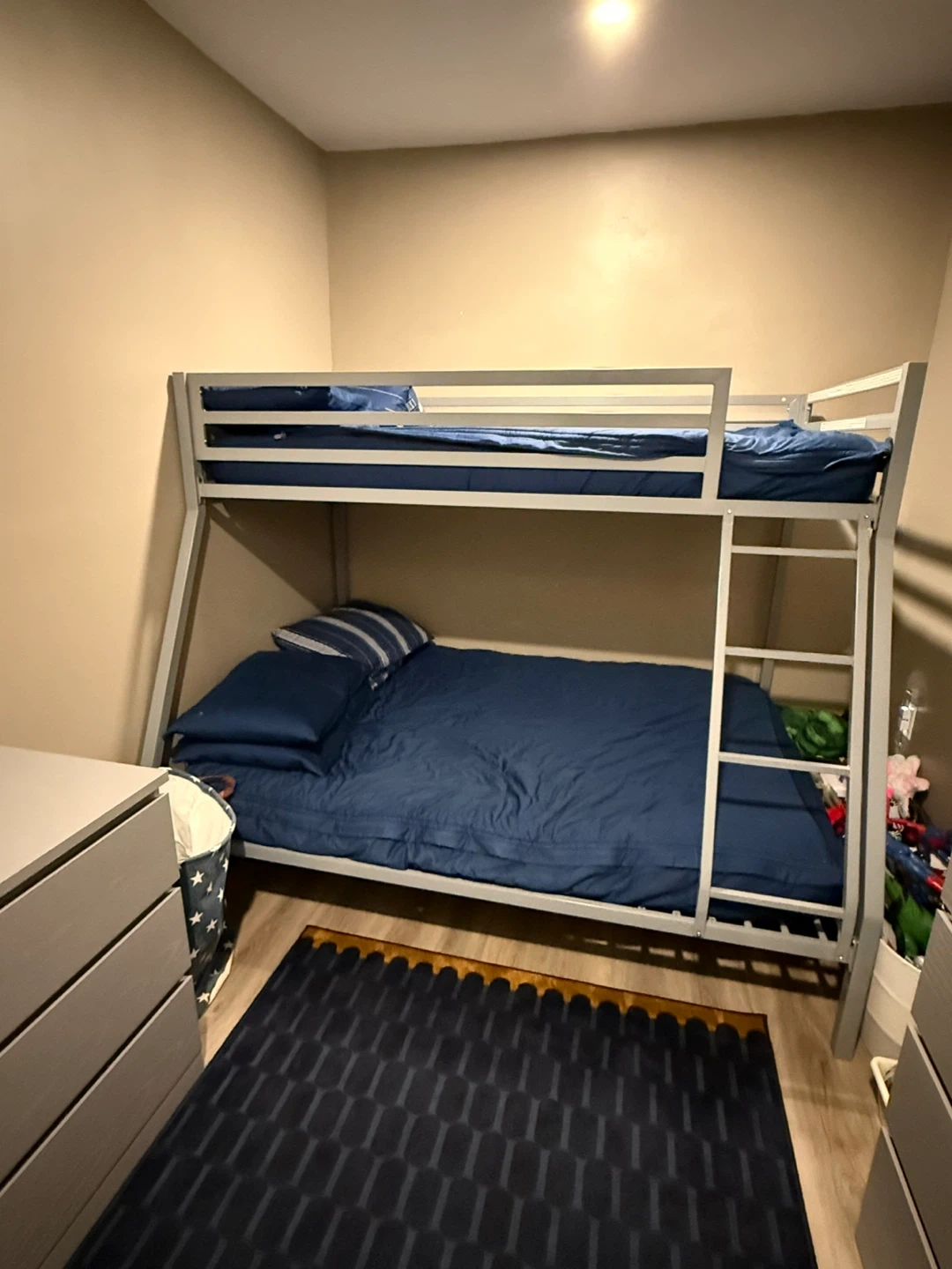 This is a sturdy metal bunk bed frame with a twin over twin size. It's built with durability in mind. It's a practical sleeping solution for kids' rooms or guest spaces. With Mattresses