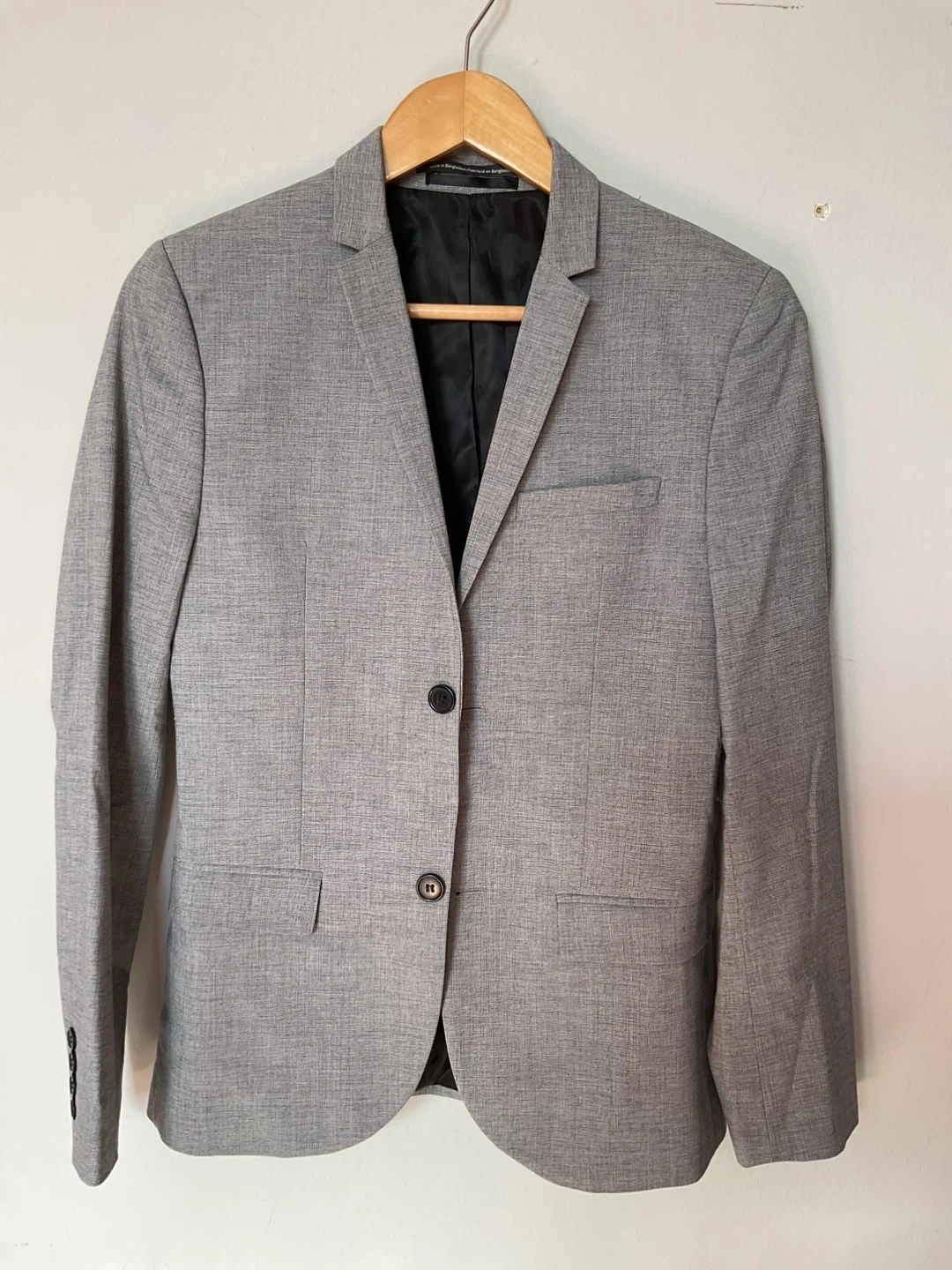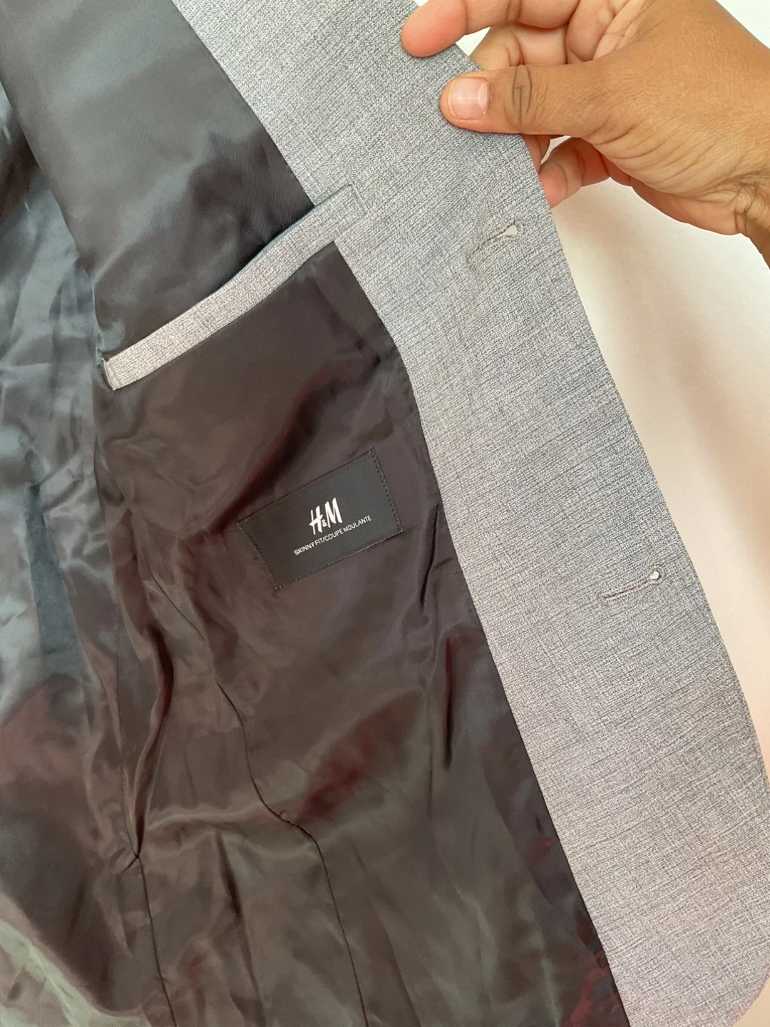 H&M grey skinny fit suit jacket. Two-button closure with two front pockets. Fully lined with an inner pocket.