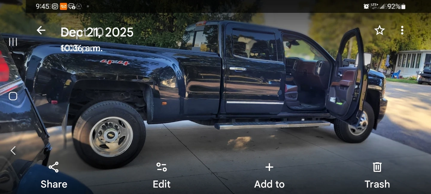 This is a black Chevrolet Silverado 3500 HD crew cab truck. It features a spacious interior with fabric seats and armrest. This truck is well-suited for hauling heavy loads.Dually Sylverado 2015