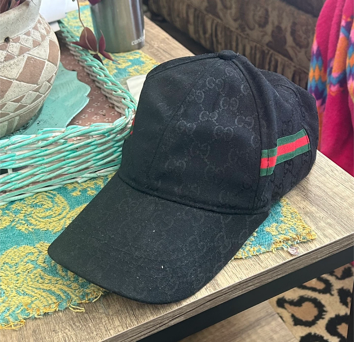 This is a black Gucci baseball cap with the iconic GG canvas pattern. It features the signature red and green stripe detail on the side. The cap is made from canvas material.