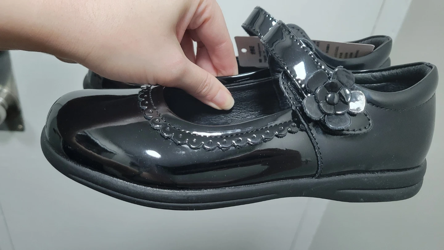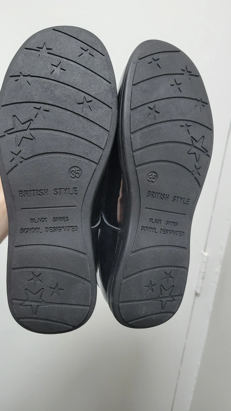 These are shiny black patent leather Mary Jane style shoes, perfect for school. They feature a convenient strap closure and a decorative flower detail on the front. The soles are marked with 'British Style Black Shoes School Designated' and size 35.