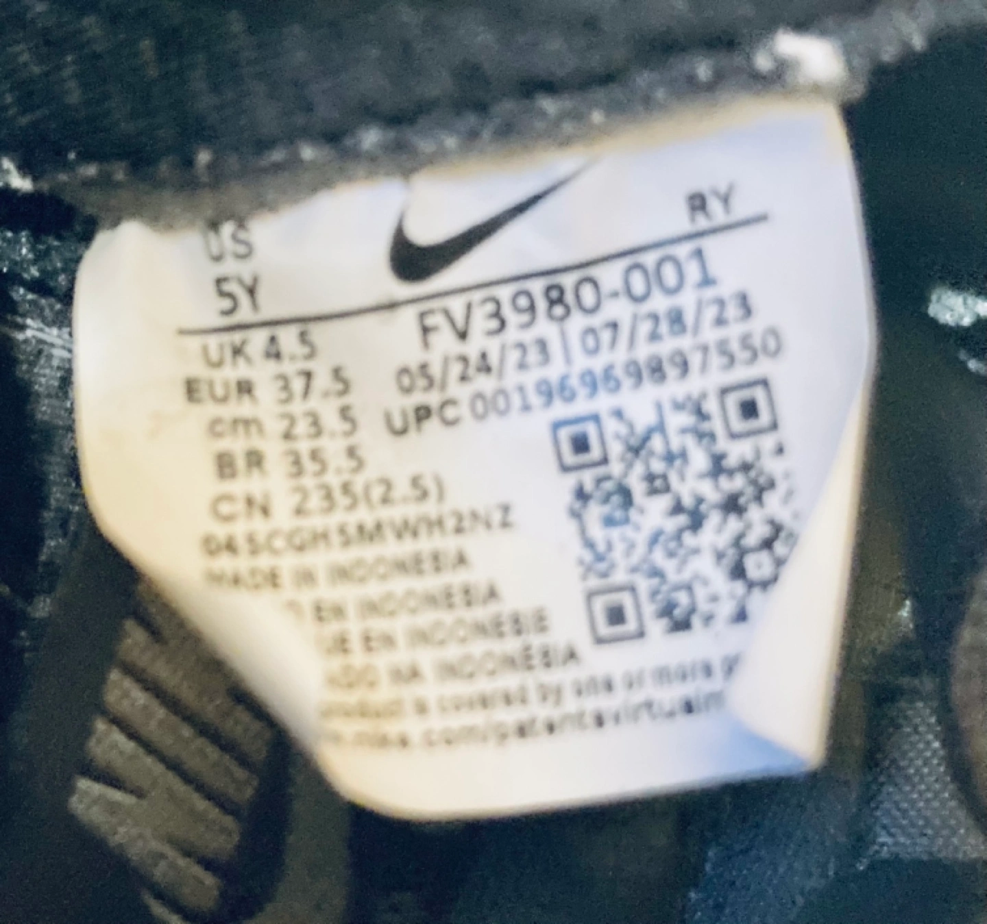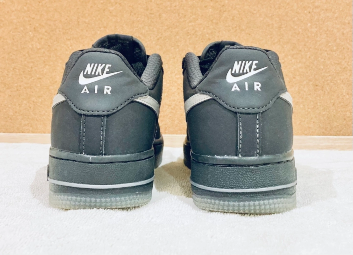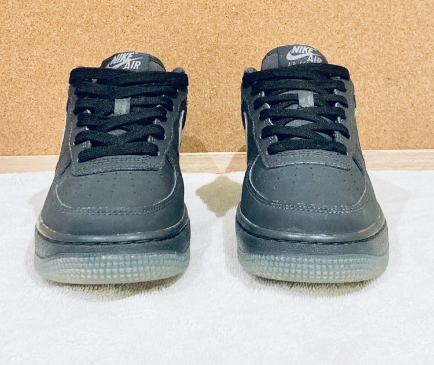 Youth-sized Nike Air Force 1 '07 low-top sneakers. Black leather upper. Translucent outsole. Black laces. Classic Nike swoosh. Reflective swoosh and Nike logo on back. US size 5Y