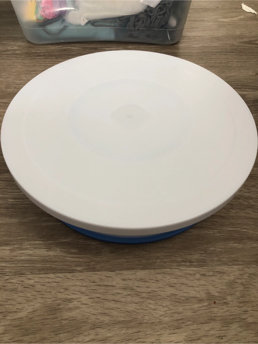 Selling a cake decorating turntable! It's in great shape and ready for your next baking project. The turntable is white with a blue base, perfect for smoothing frosting or adding detailed decorations to your cakes