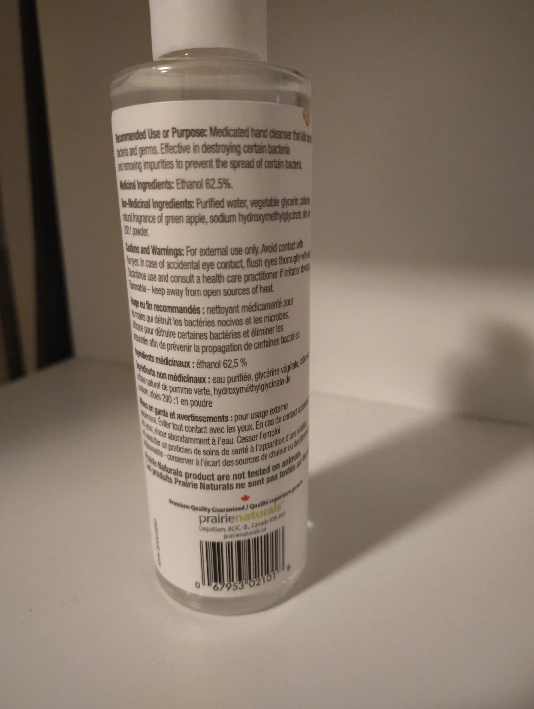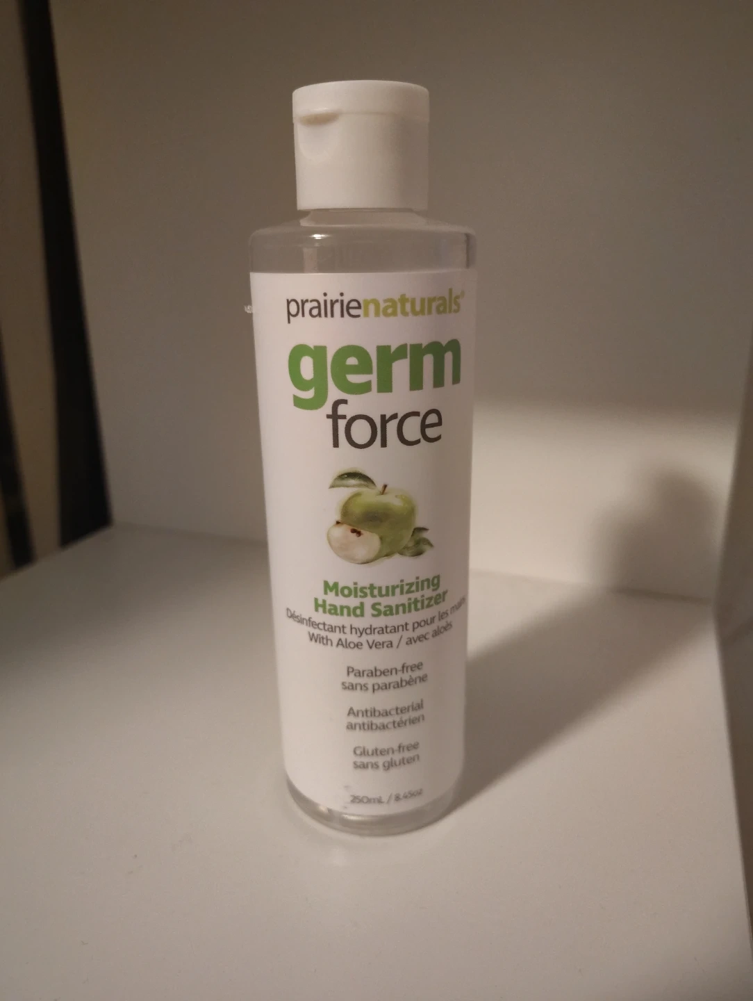 Prairie Naturals Germ Force Moisturizing Hand Sanitizer with Aloe Vera and green apple fragrance. It's paraben-free and gluten-free. Medicinal ingredients: Ethanol 62.5%. This product is effective in destroying certain bacteria and germs. Keep it away from open flame.