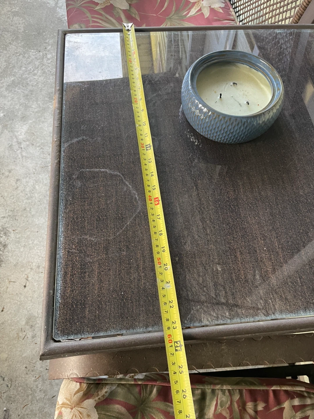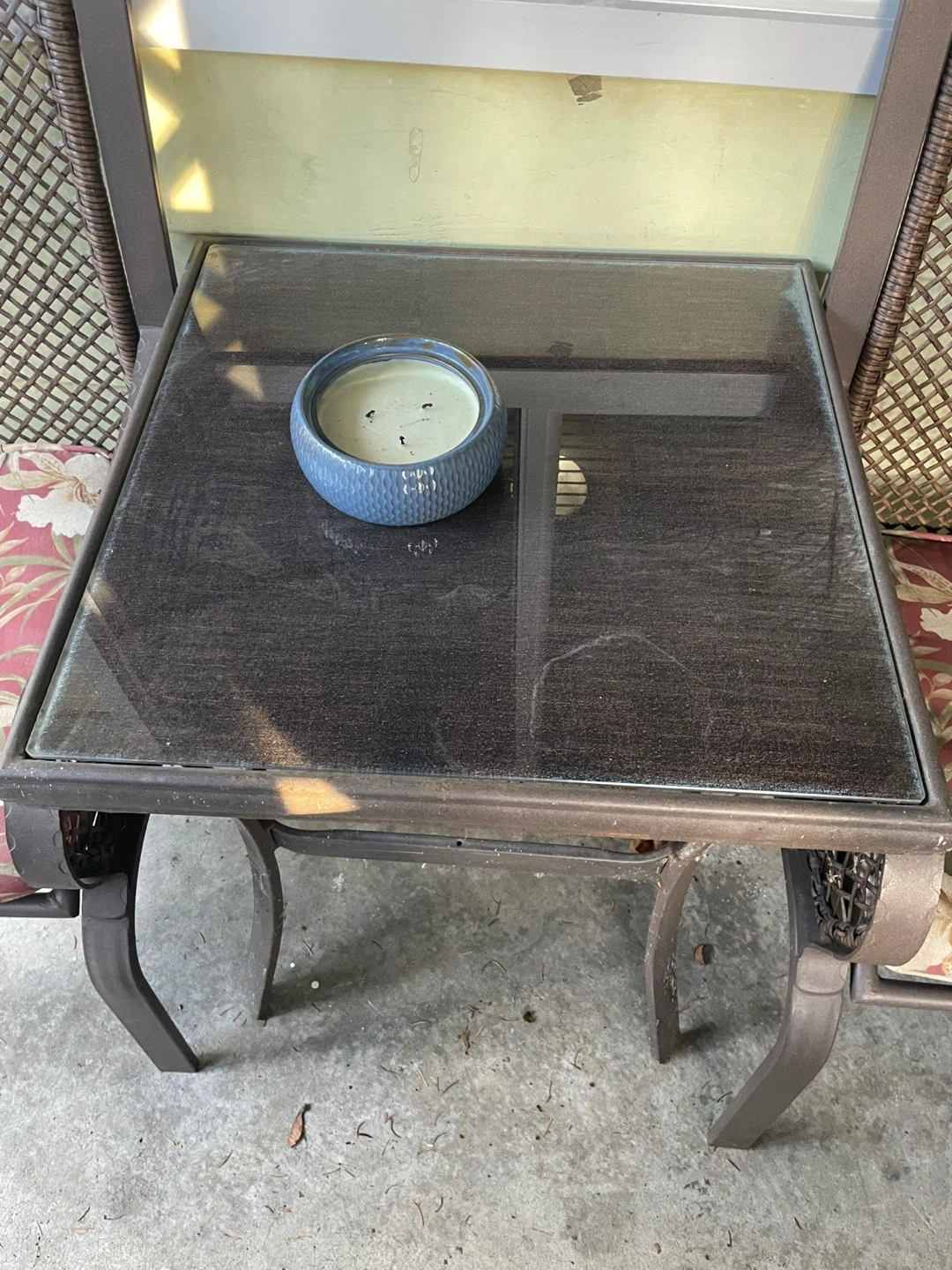 Selling a charming outdoor patio set! It comes with two chairs that have comfy floral cushions and a glass-topped table. The chairs have a lovely woven design, and the table is perfect for drinks or snacks while you enjoy the outdoors