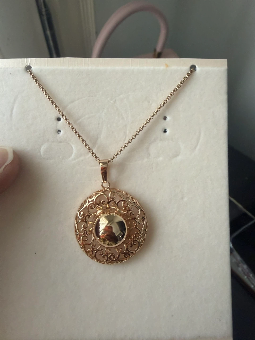 A lovely gold-tone pendant necklace featuring an intricate filigree design with a central polished dome. It's attached to a delicate chain.