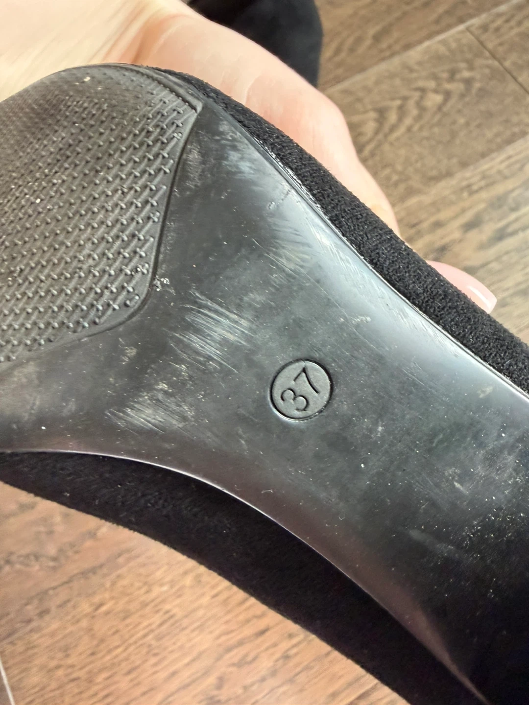Stylish black suede block heels. These shoes are a European size 37. They've got a chic pointed toe and a comfortable block heel. Dress 'em up or down!