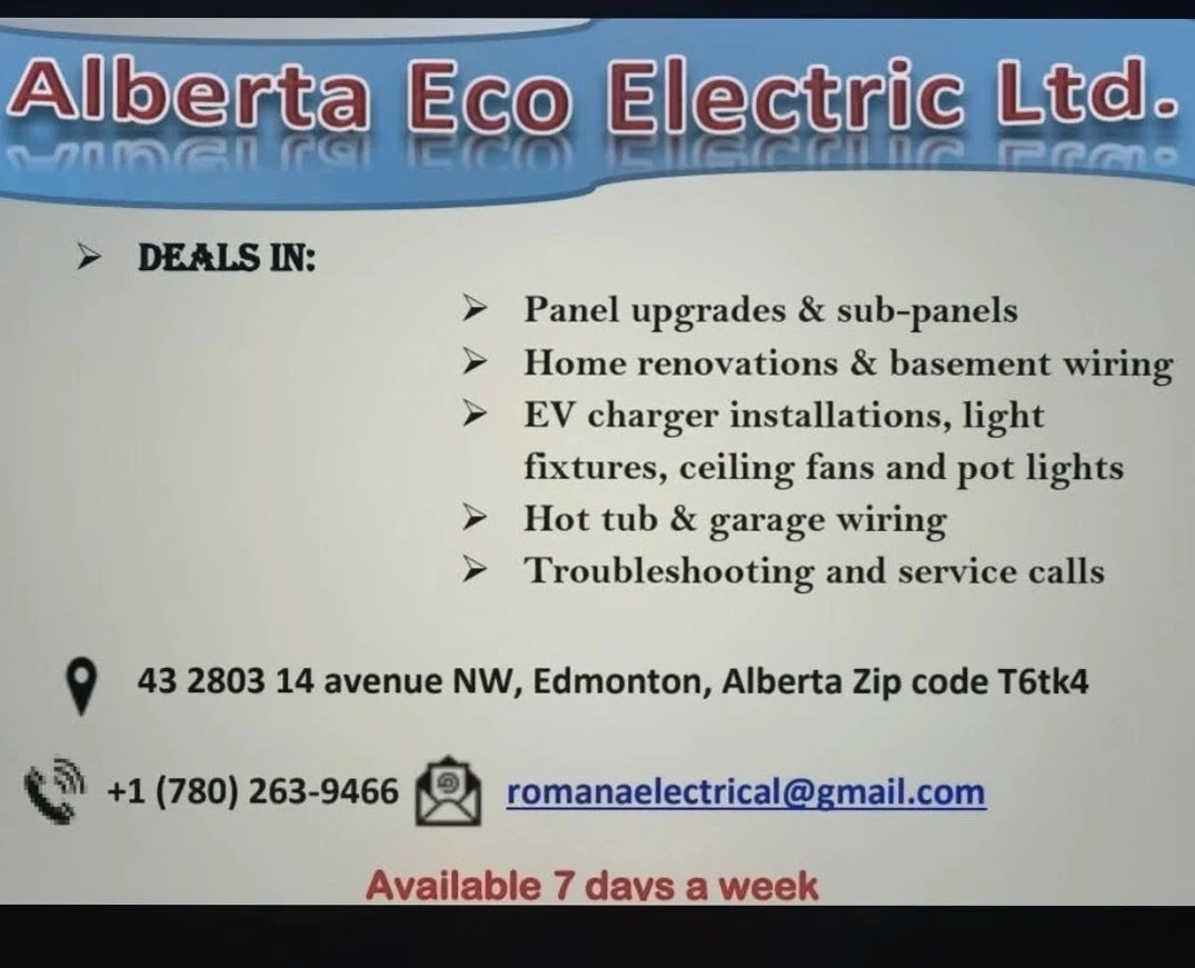 Alberta Eco Electric Ltd. offers a variety of electrical services. They deal in panel upgrades, home renovations, basement wiring, and EV charger installations. Services also include light fixtures, ceiling fans, pot lights, hot tub and garage wiring, plus troubleshooting and service calls. Available 7 days a week!