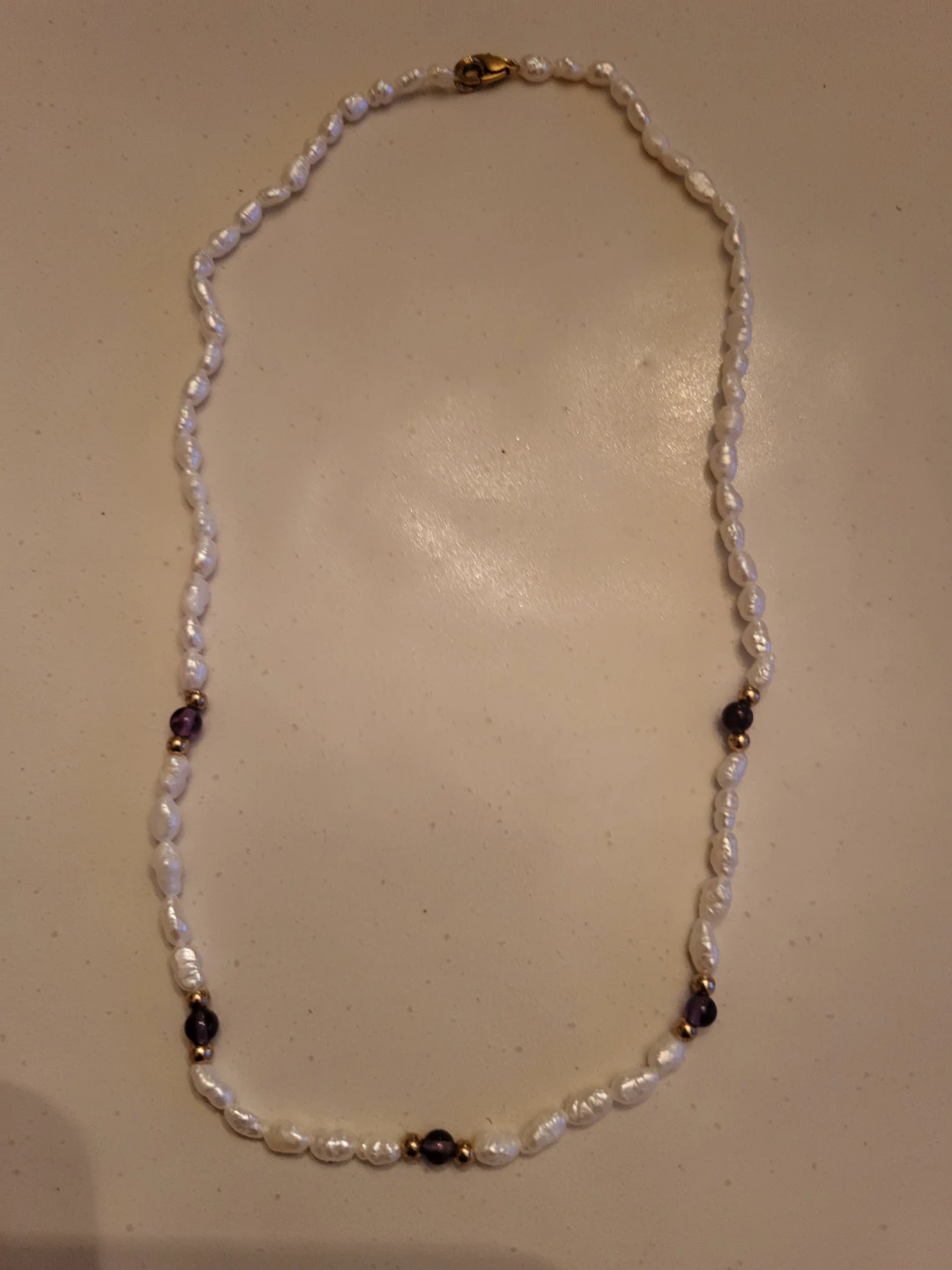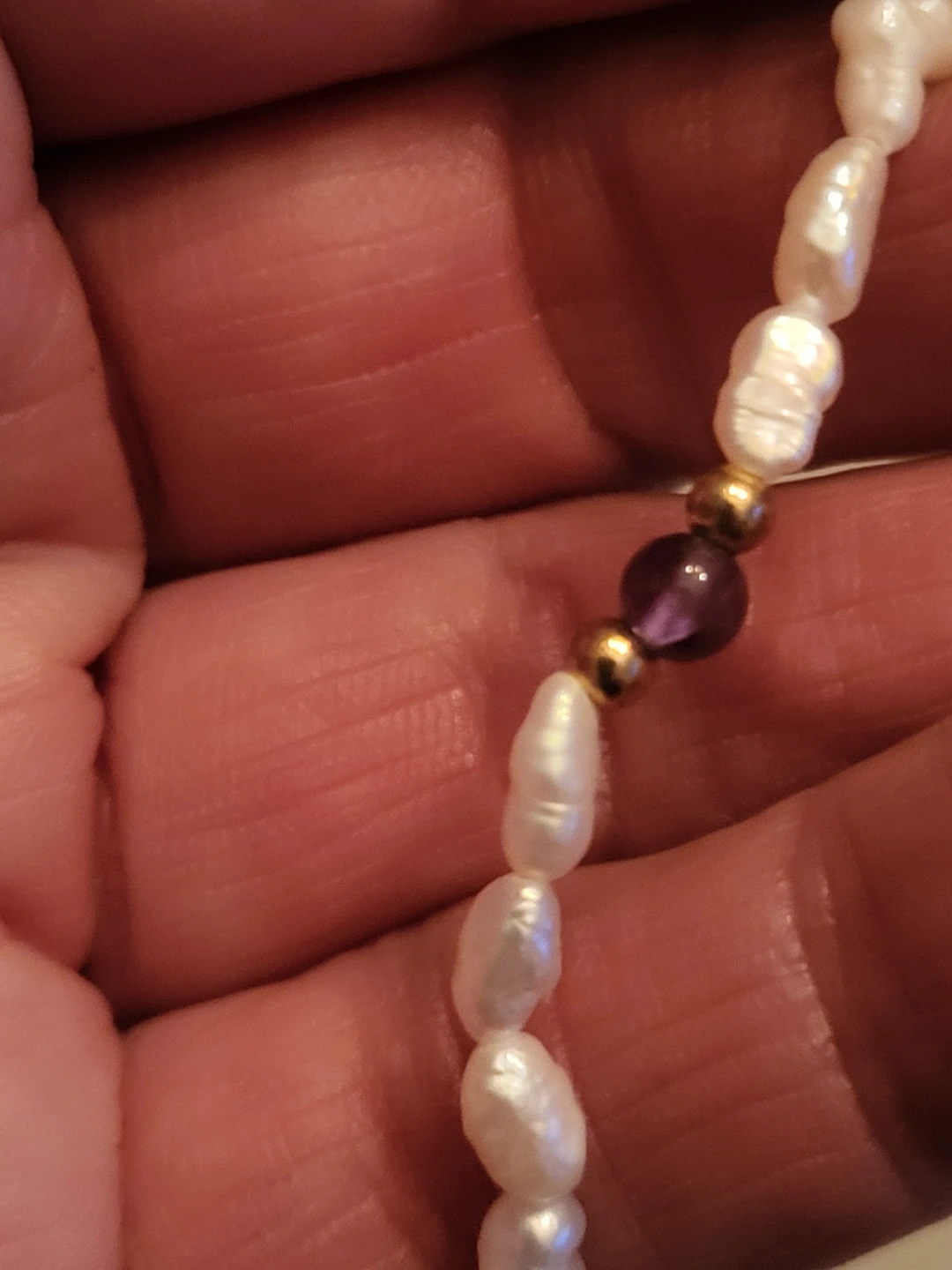 Buy & SellPearl and Amethyst NecklacePearl and Amethyst Necklace$30This necklace features irregular freshwater pearls and small amethyst beads. Gold-toned clasp closure. It's a lovely piece for everyday wear! 16"ConditionLike newSize16"WHERE TO MEETWorthingtonView MapSELLERverifiedTammyWorthington18214 reviews0 chats·0 favorites·3 viewsSEND CHAT TO SELLERHi Tammy! I’m interested in your listing.Hi Tammy! I’m interested in your listing.Get the Karrot app to chatSign In to chat