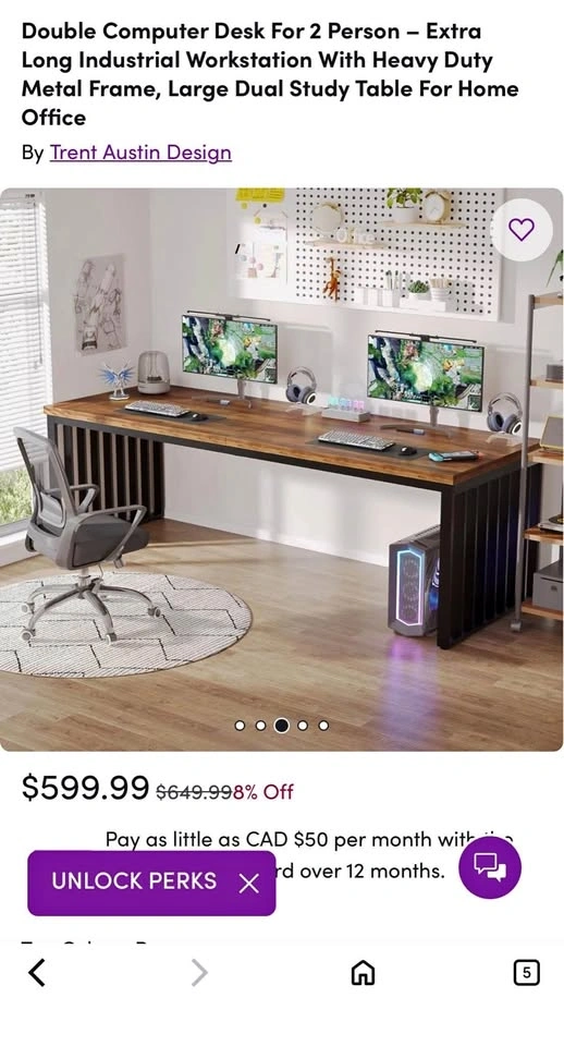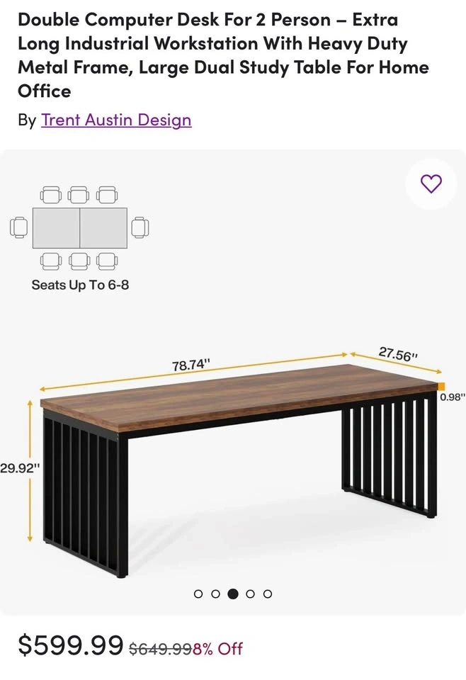 This is a new, open-box, never-used Tribesigns 78.74" Extra Long Computer Desk for 2 Person. It features a heavy-duty metal frame and a brown wood grain finish, offering a sleek industrial design. The desk measures 78.74" wide x 27.56" deep, providing ample space for two people to work side-by-side comfortably. It's versatile for home offices, study rooms, or professional workplaces, with enough room for multiple monitors, laptops, and documents. Please note that due to the materials used, the wood grain on the board may vary slightly. The price is firm.
