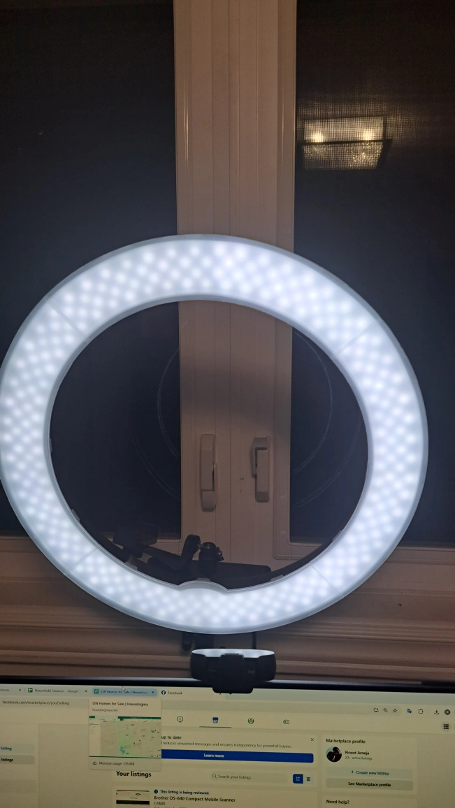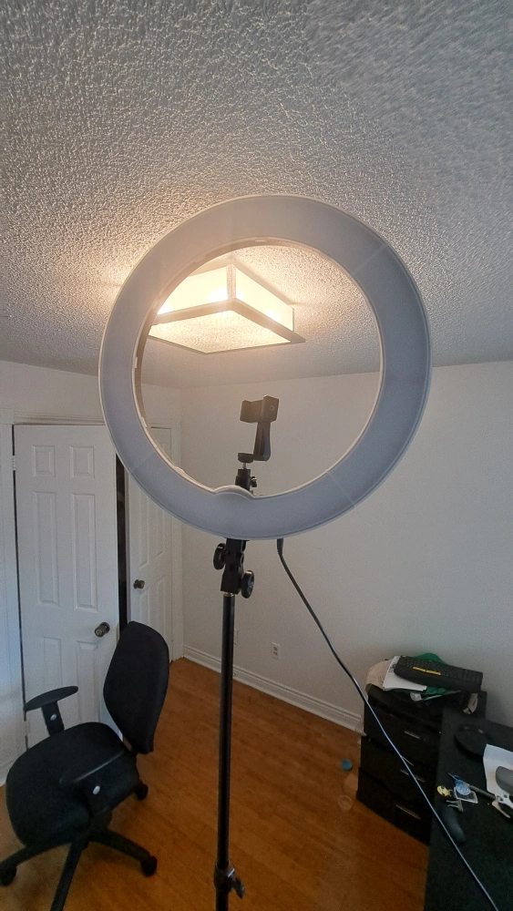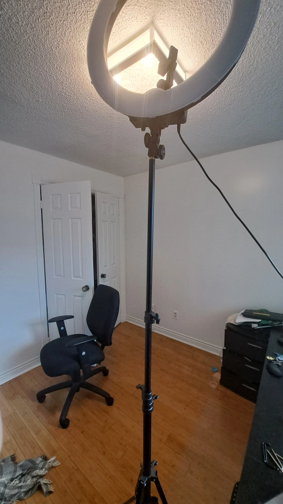 24" LED ring light in great condition! Has a dimmer so you can adjust the brightness. You can adjust the angle, and also the height to 8 feet!! Perfect for content creation or video calls. It's lightweight and portable.
