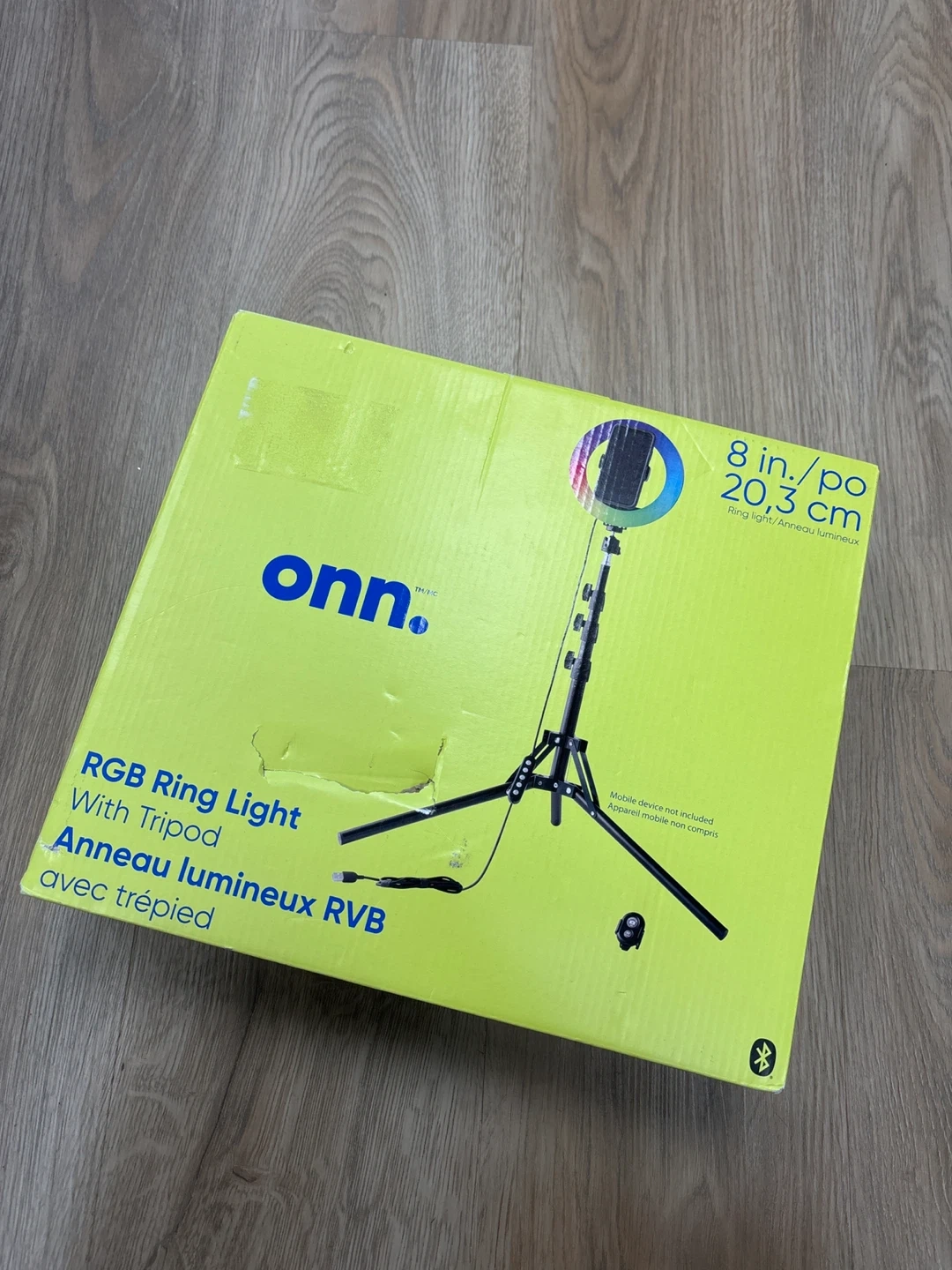 This is an Onn. 8-inch RGB ring light with a tripod. It comes with a USB power cable and a Bluetooth remote. The mobile device is not included.