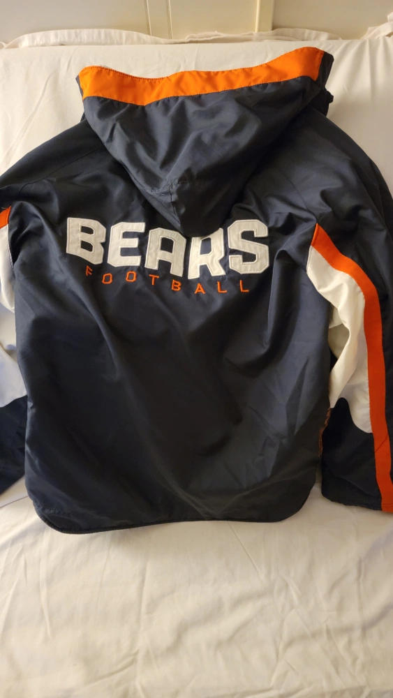Chicago Bears jacket with orange, white, and navy blue accents. Fleece lining. Size Large. 14-16 youth. inside velcro pocket, outside zipper pockets. Cozy and warm!