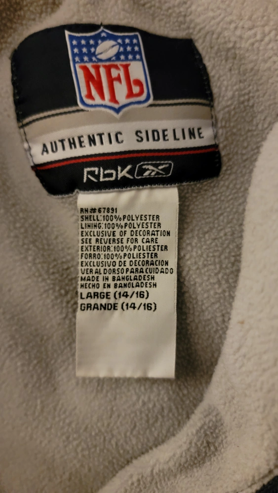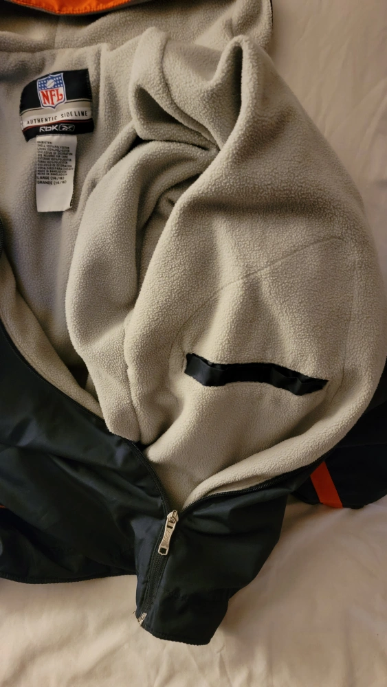 Chicago Bears jacket with orange, white, and navy blue accents. Fleece lining. Size Large. 14-16 youth. inside velcro pocket, outside zipper pockets. Cozy and warm!