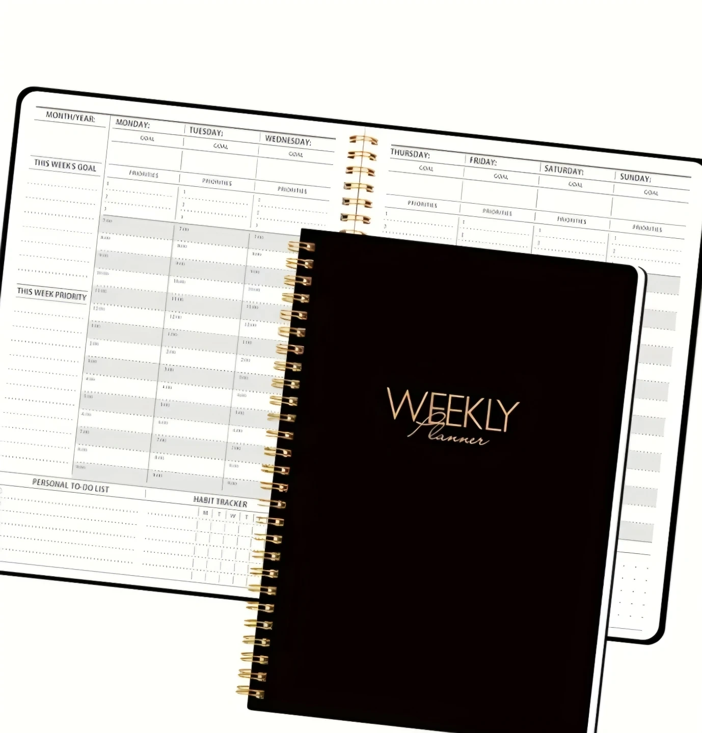 This weekly planner features daily goal and priority sections, along with a personal to-do list and habit tracker. It has a durable black cover and gold spiral binding for easy page turning. 100 pages for 1-year.
