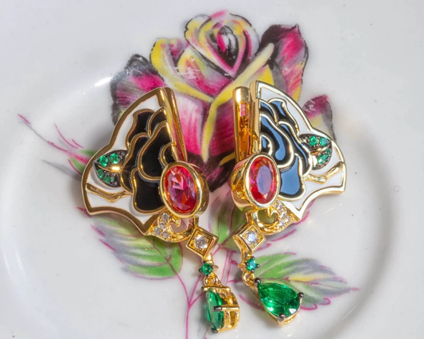 These dangle earrings feature a gold-tone finish with red and green gemstone accents. They have an enamel design with intricate detailing. The earrings have a leverback closure.