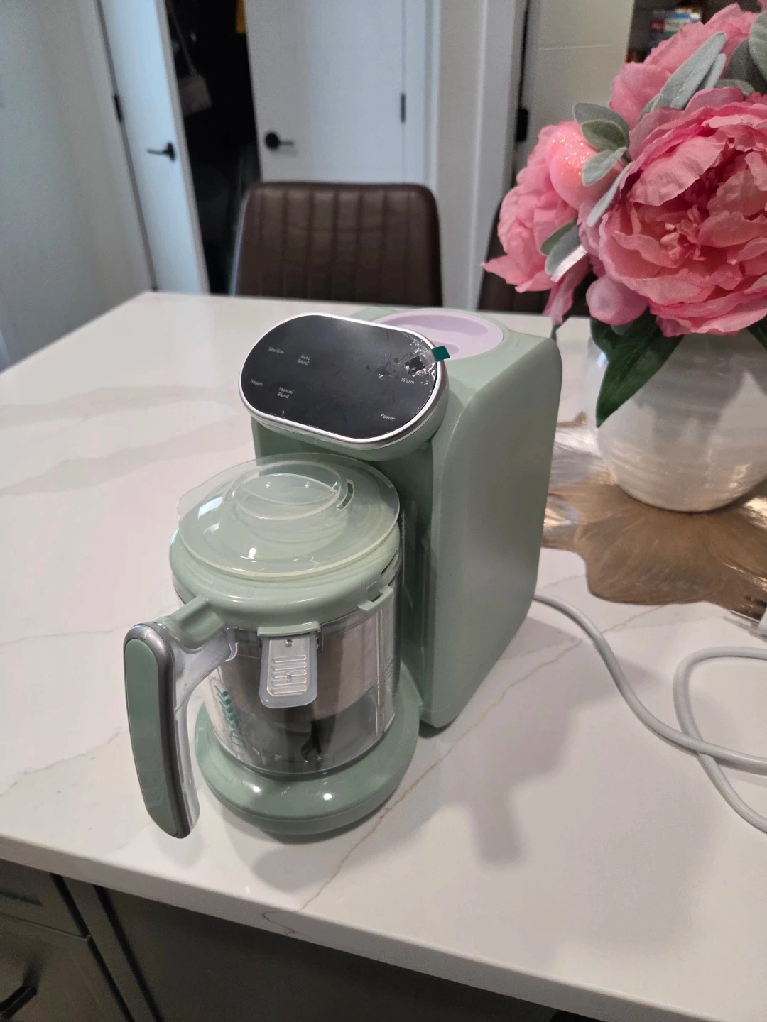 This baby food maker steams and blends food for your little one. It steams, auto-blends, sterilizes, and warms. Making homemade baby food is easy with this appliance. It's a great kitchen helper for parents!