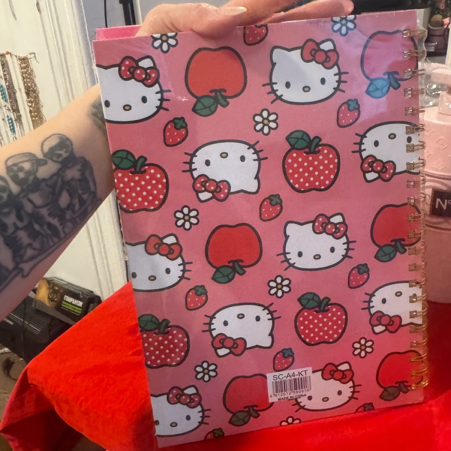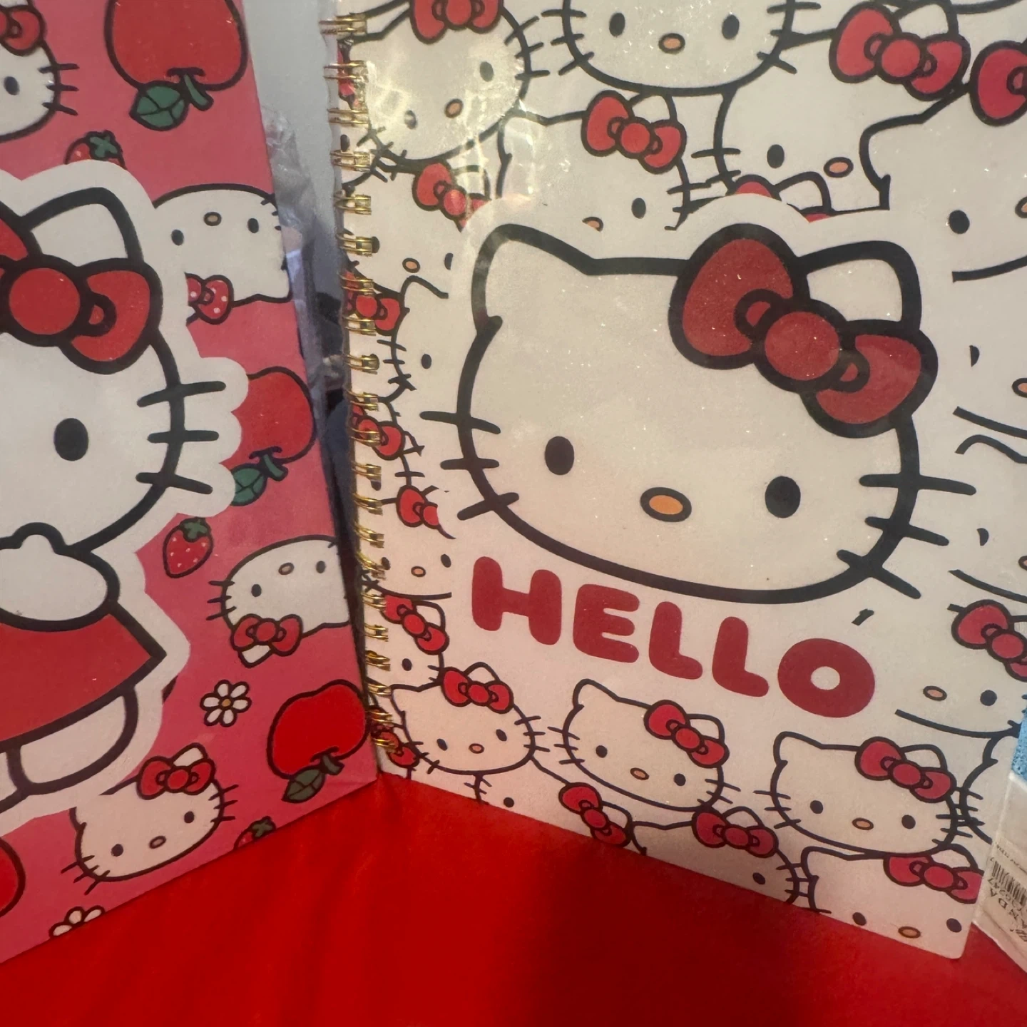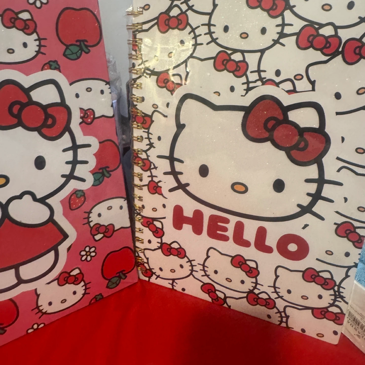 Cute Hello Kitty spiral notebook featuring multiple designs of Hello Kitty and apples. Includes a sturdy spiral binding for easy page turning. Perfect for school, journaling, or doodling! $6