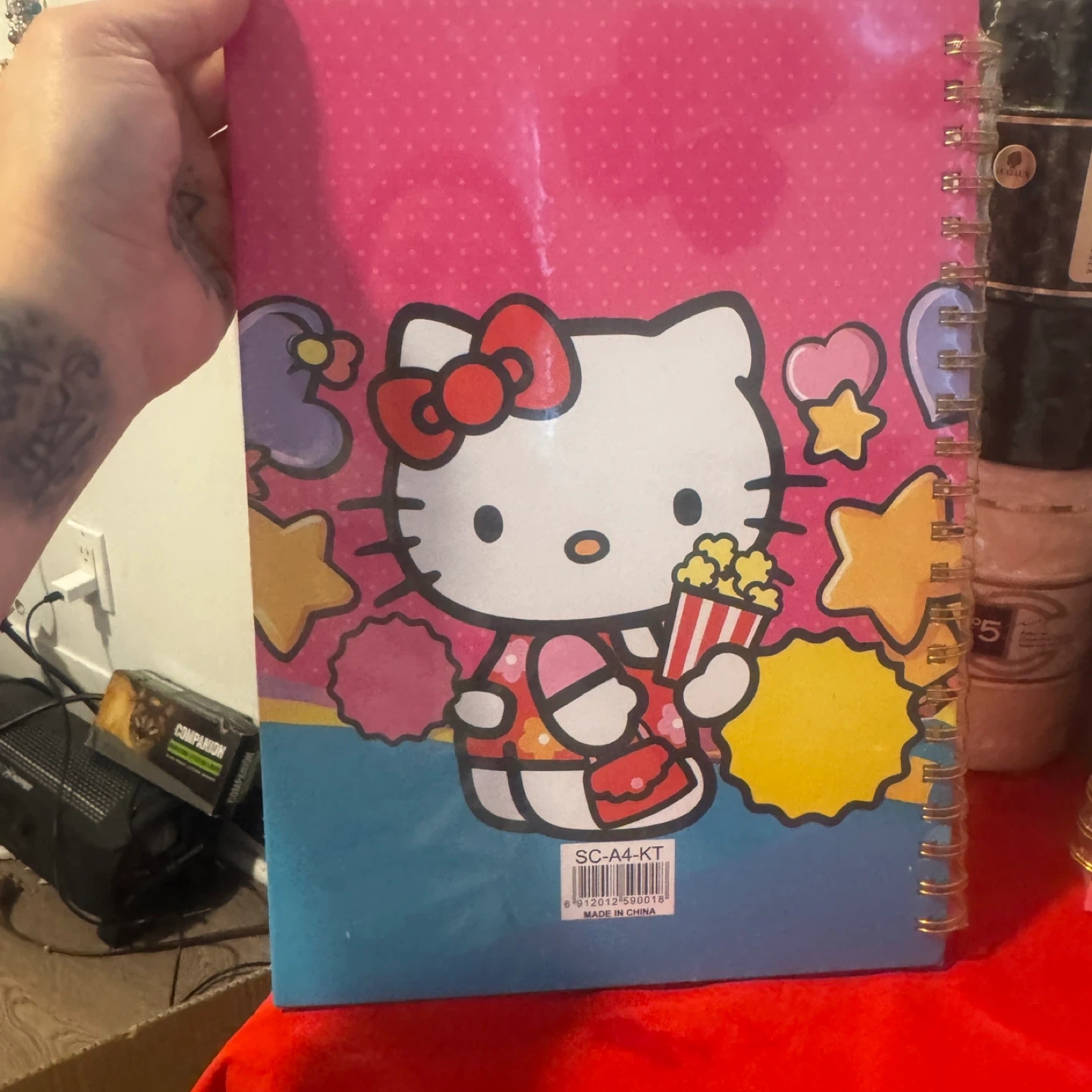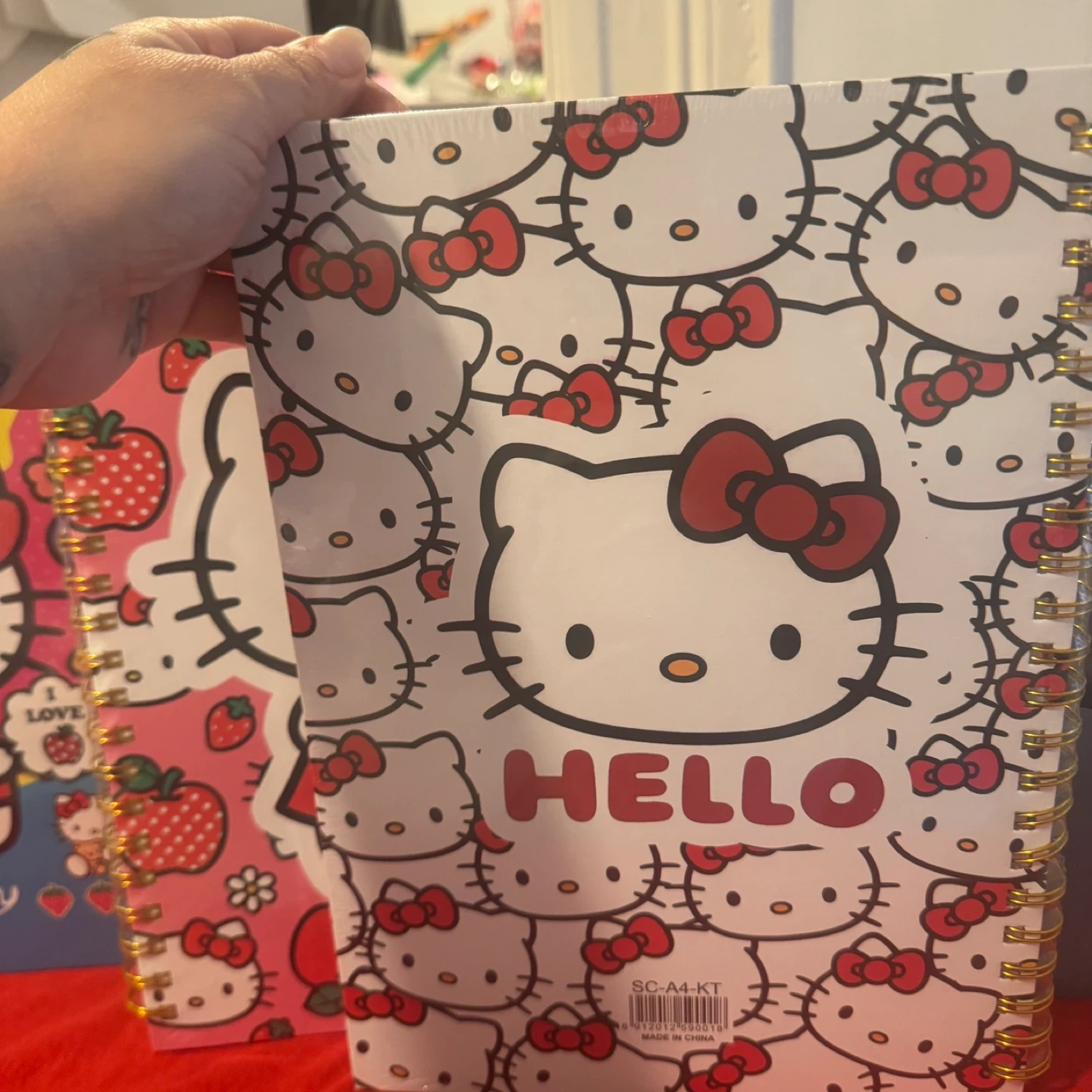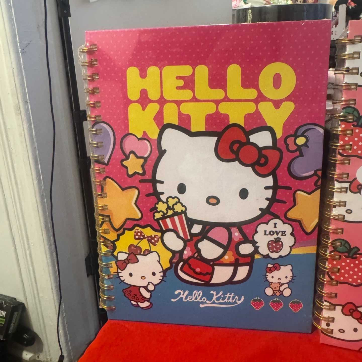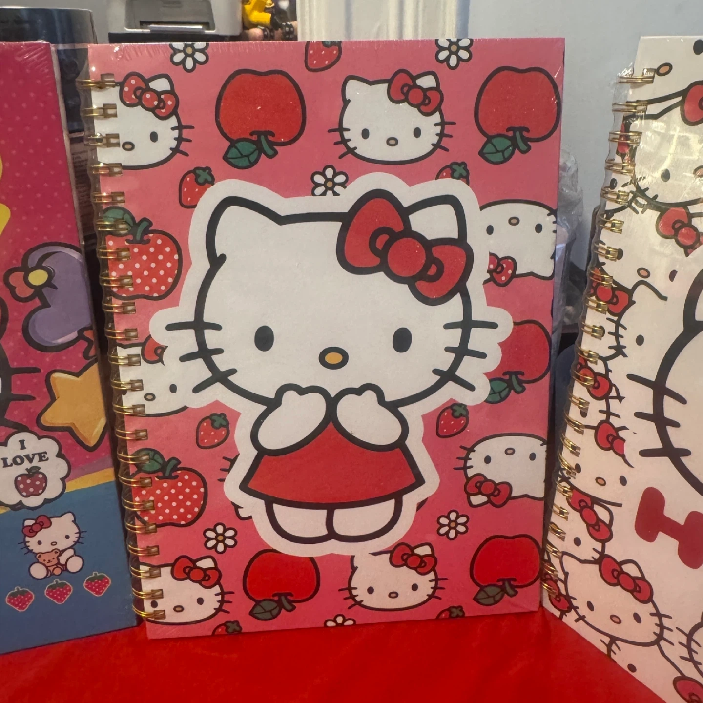 Cute Hello Kitty spiral notebook featuring multiple designs of Hello Kitty and apples. Includes a sturdy spiral binding for easy page turning. Perfect for school, journaling, or doodling! $6