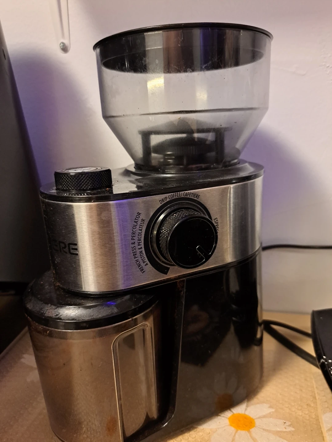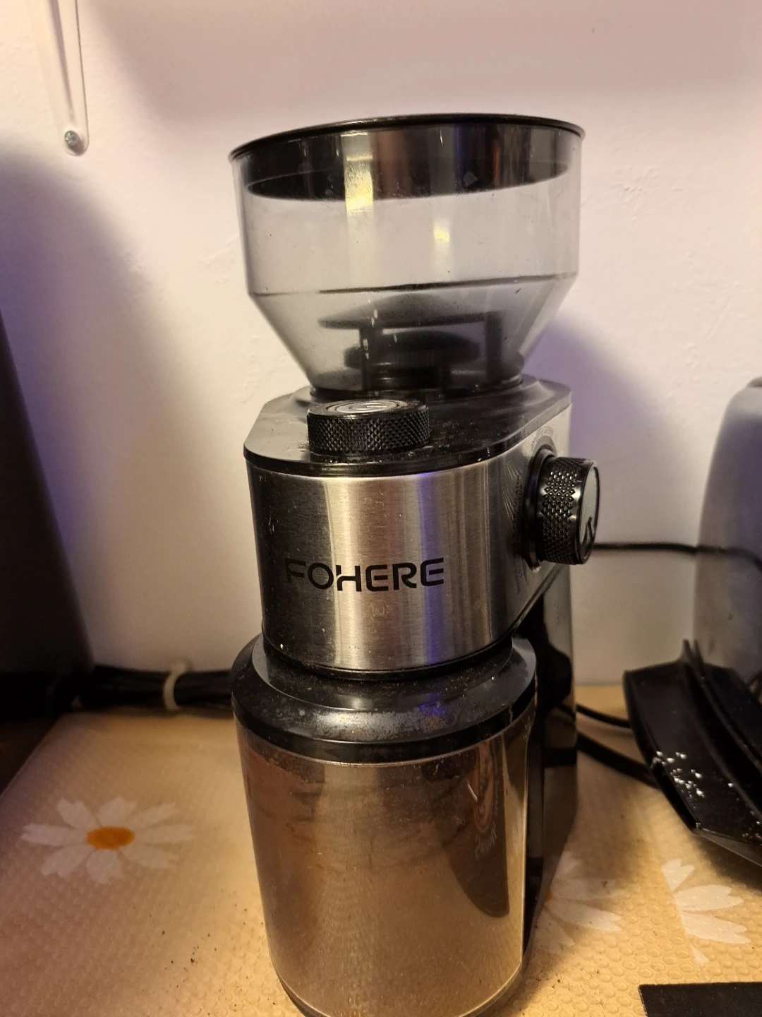 This is a FOHERE electric coffee grinder. It has settings for drip coffee, percolator, and espresso. The grinder has a removable bin for easy cleaning.